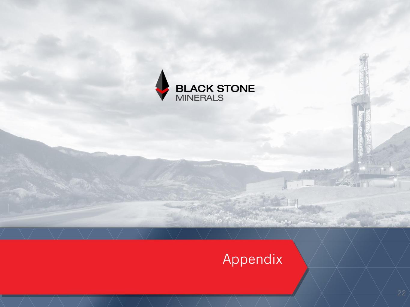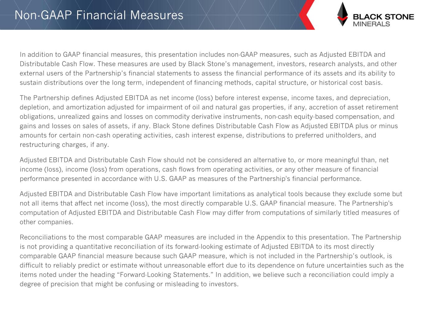 Non-GAAP Financial Measures In addition to GAAP financial measures, this presentation includes non-GAAP measures, such as Adjusted EBITDA and Distributable Cash Flow. These measures are used by Black Stone’s management, investors, research analysts, and other external users of the Partnership’s financial statements to assess the financial performance of its assets and its ability to sustain distributions over the long term, independent of financing methods, capital structure, or historical cost basis. The Partnership defines Adjusted EBITDA as net income (loss) before interest expense, income taxes, and depreciation, depletion, and amortization adjusted for impairment of oil and natural gas properties, if any, accretion of asset retirement obligations, unrealized gains and losses on commodity derivative instruments, non-cash equity-based compensation, and gains and losses on sales of assets, if any. Black Stone defines Distributable Cash Flow as Adjusted EBITDA plus or minus amounts for certain non-cash operating activities, cash interest expense, distributions to preferred unitholders, and restructuring charges, if any. Adjusted EBITDA and Distributable Cash Flow should not be considered an alternative to, or more meaningful than, net income (loss), income (loss) from operations, cash flows from operating activities, or any other measure of financial performance presented in accordance with U.S. GAAP as measures of the Partnership's financial performance. Adjusted EBITDA and Distributable Cash Flow have important limitations as analytical tools because they exclude some but not all items that affect net income (loss), the most directly comparable U.S. GAAP financial measure. The Partnership's computation of Adjusted EBITDA and Distributable Cash Flow may differ from computations of similarly titled measures of other companies. Reconciliations to the most comparable GAAP measures are included in the Appendix to this presentation. The Partnership is not providing a quantitative reconciliation of its forward-looking estimate of Adjusted EBITDA to its most directly comparable GAAP financial measure because such GAAP measure, which is not included in the Partnership’s outlook, is difficult to reliably predict or estimate without unreasonable effort due to its dependence on future uncertainties such as the items noted under the heading “Forward-Looking Statements.” In addition, we believe such a reconciliation could imply a degree of precision that might be confusing or misleading to investors.