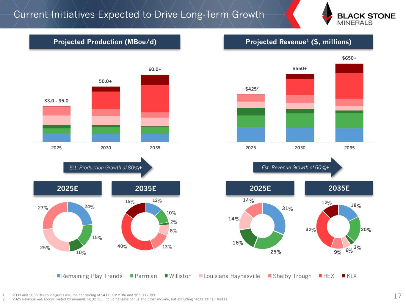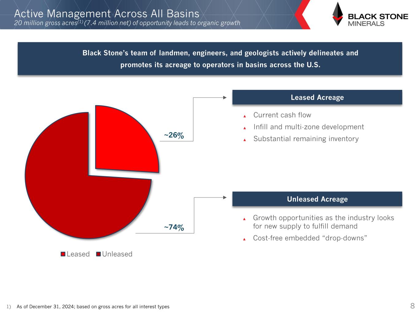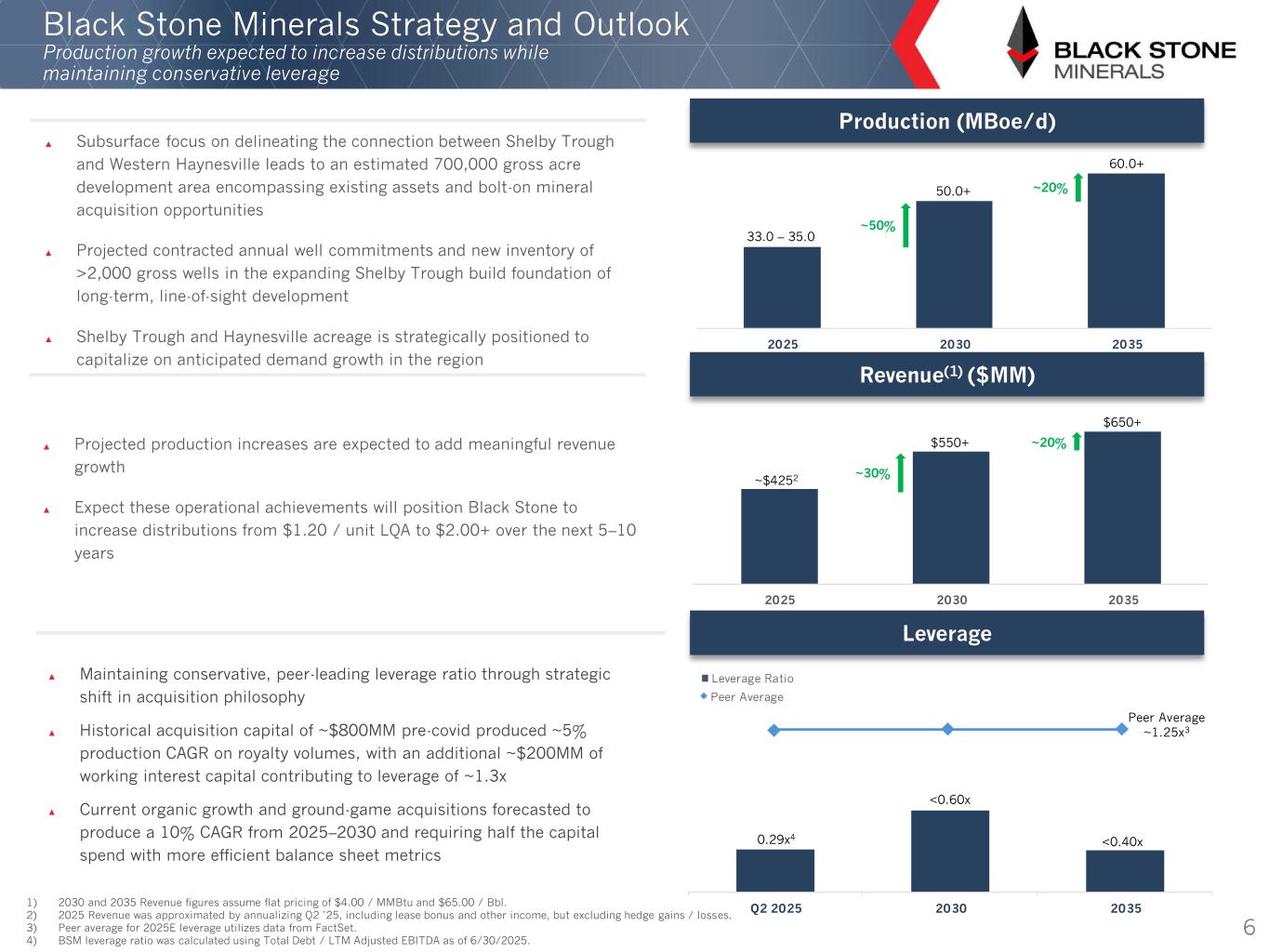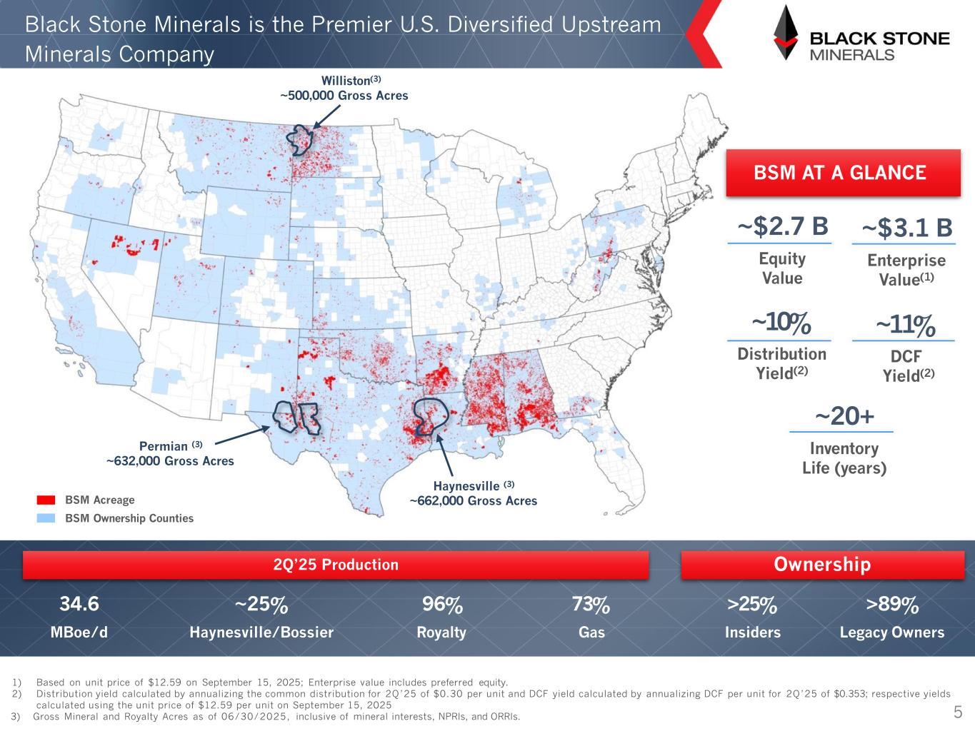 ~$2.7 B Equity Value ~$3.1 B Enterprise Value(1) ~10% Distribution Yield(2) Black Stone Minerals is the Premier U.S. Diversified Upstream Minerals Company 1) Based on unit price of $12.59 on September 15, 2025; Enterprise value includes preferred equity. 2) Distribution yield calculated by annualizing the common distribution for 2Q’25 of $0.30 per unit and DCF yield calculated by annualizing DCF per unit for 2Q’25 of $0.353; respective yields calculated using the unit price of $12.59 per unit on September 15, 2025 3) Gross Mineral and Royalty Acres as of 06/30/2025, inclusive of mineral interests, NPRIs, and ORRIs. BSM AT A GLANCE Ownership2Q’25 Production 34.6 MBoe/d BSM Acreage BSM Ownership Counties Permian (3) ~632,000 Gross Acres Haynesville (3) ~662,000 Gross Acres Williston(3) ~500,000 Gross Acres 96% Royalty ~25% Haynesville/Bossier 73% Gas >25% Insiders >89% Legacy Owners ~11% DCF Yield(2) ~20+ Inventory Life (years) 5