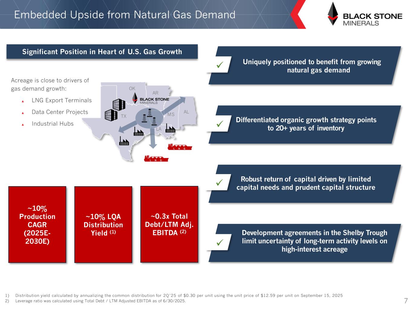 2 25 2 2 5 Black Stone Minerals Strategy and Outlook Production growth expected to increase distributions while maintaining conservative leverage ▲ Maintaining conservative, peer-leading leverage ratio through strategic shift in acquisition philosophy ▲ Historical acquisition capital of ~$800MM pre-covid produced ~5% production CAGR on royalty volumes, with an additional ~$200MM of working interest capital contributing to leverage of ~1.3x ▲ Current organic growth and ground-game acquisitions forecasted to produce a 10% CAGR from 2025–2030 and requiring half the capital spend with more efficient balance sheet metrics 6 Production (MBoe/d) Revenue(1) ($MM) Leverage 2 25 2 2 5 ~50% ~20% ~30% ~20% Q2 2 25 2 2 5 ▲ Subsurface focus on delineating the connection between Shelby Trough and Western Haynesville leads to an estimated 700,000 gross acre development area encompassing existing assets and bolt-on mineral acquisition opportunities ▲ Projected contracted annual well commitments and new inventory of >2,000 gross wells in the expanding Shelby Trough build foundation of long-term, line-of-sight development ▲ Shelby Trough and Haynesville acreage is strategically positioned to capitalize on anticipated demand growth in the region ▲ Projected production increases are expected to add meaningful revenue growth ▲ Expect these operational achievements will position Black Stone to increase distributions from $1.20 / unit LQA to $2.00+ over the next 5–10 years 1) 2030 and 2035 Revenue figures assume flat pricing of $4.00 / MMBtu and $65.00 / Bbl. 2) 2025 Revenue was approximated by annualizing Q2 ’25, including lease bonus and other income, but excluding hedge gains / losses. 3) Peer average for 2025E leverage utilizes data from FactSet. 4) BSM leverage ratio was calculated using Total Debt / LTM Adjusted EBITDA as of 6/30/2025. 33.0 – 35.0 50.0+ 60.0+ ~$4252 $550+ $650+ 0.29x4 <0.60x <0.40x Peer Average ~1.25x3 Peer Average Leverage Ratio
