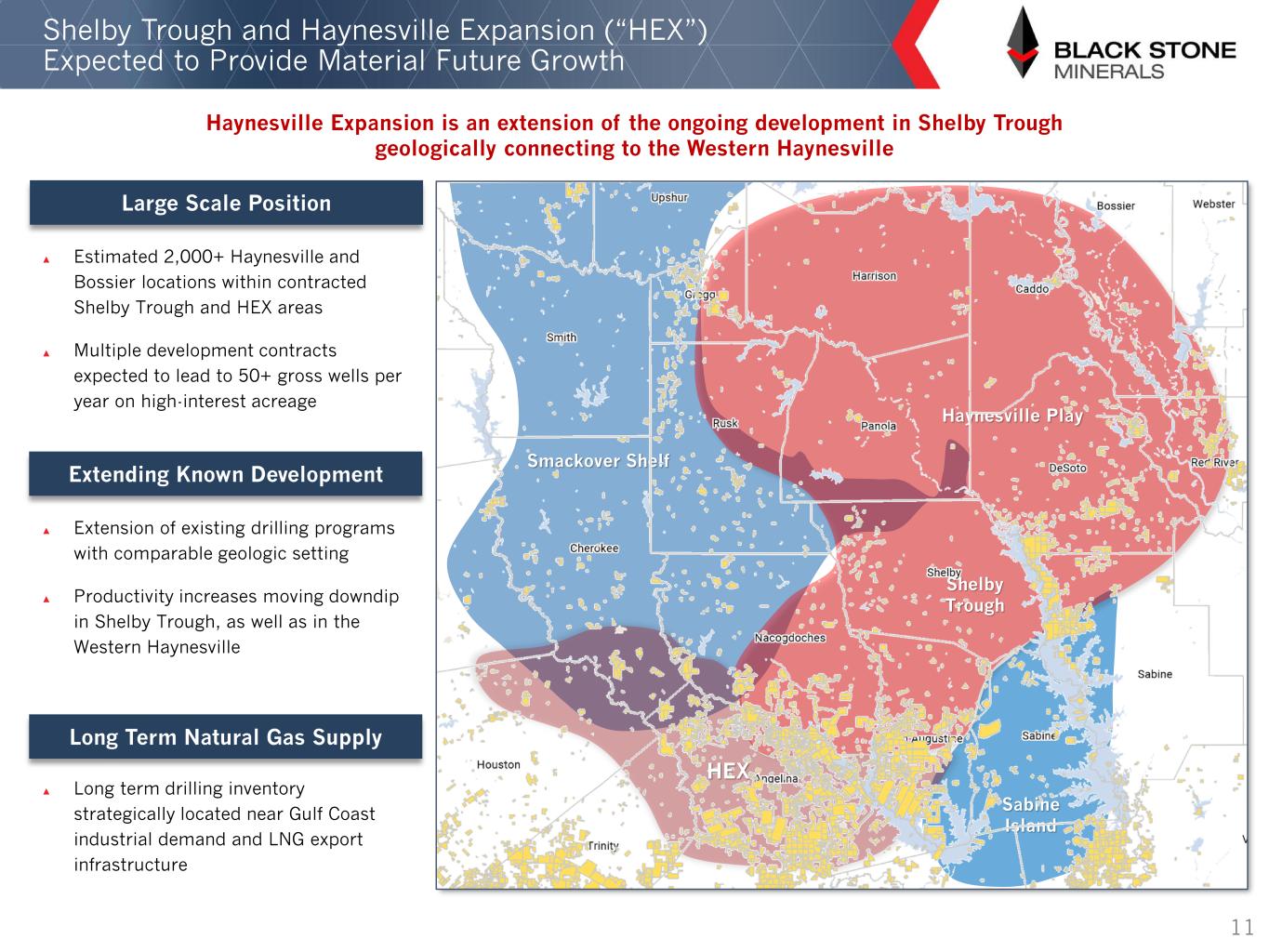 16% 13% 7% 6% 23% 35% 28% 72% Haynesville Basin Primed for Growth 101) As of 06/30/25, inclusive of mineral interests, NPRIs, and ORRIs 2) Permit data sourced from IHS and represents permits filed through 6/30/2025 5,200 gross 8 7 9 6 7 7 8 7 0 2 4 6 8 10 Jan-25 Feb-25 Mar-25 Apr-25 May-25 Jun-25 Jul-25 Aug-25 Aethon Expand Comstock Others R ig C o u n t b y O p e ra to r ▲ Substantial remaining inventory across top operators throughout Haynesville and expanding Shelby Trough ▲ BSM acreage well positioned to benefit from expected growth in natural gas demand ▲ Shelby Trough development agreements provide unique line of sight to contractual activity increases Drilling Activity on BSM’s Position Estimated Haynesville Locations 2025E Revenue Sabine Island Shelby Trough Haynesville Play Smackover Shelf HEX Key Statistics Gross Mineral and Royalty Acres1 ~662,000 Permits on BSM last 12 mos2 78 % Permits on BSM acreage last 12 mos2 32% Haynesville Other BSM Assets