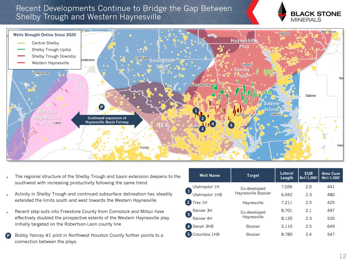Sabine Island Shelby Trough Haynesville Play Smackover Shelf HEX Shelby Trough and Haynesville Expansion (“HEX”) Expected to Provide Material Future Growth 11 Haynesville Expansion is an extension of the ongoing development in Shelby Trough geologically connecting to the Western Haynesville Large Scale Position ▲ Estimated 2,000+ Haynesville and Bossier locations within contracted Shelby Trough and HEX areas ▲ Multiple development contracts expected to lead to 50+ gross wells per year on high-interest acreage Extending Known Development ▲ Extension of existing drilling programs with comparable geologic setting ▲ Productivity increases moving downdip in Shelby Trough, as well as in the Western Haynesville Long Term Natural Gas Supply ▲ Long term drilling inventory strategically located near Gulf Coast industrial demand and LNG export infrastructure