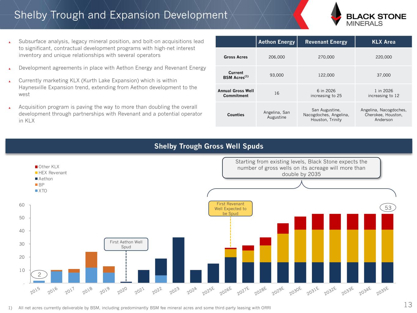 Shelby Trough Gross Well Spuds Shelby Trough and Expansion Development ▲ Subsurface analysis, legacy mineral position, and bolt-on acquisitions lead to significant, contractual development programs with high-net interest inventory and unique relationships with several operators ▲ Development agreements in place with Aethon Energy and Revenant Energy ▲ Currently marketing KLX (Kurth Lake Expansion) which is within Haynesville Expansion trend, extending from Aethon development to the west ▲ Acquisition program is paving the way to more than doubling the overall development through partnerships with Revenant and a potential operator in KLX 13 2 5 0 20 0 0 50 0 Other LX HEX Revenant Aethon BP XTO Starting from existing levels, Black Stone expects the number of gross wells on its acreage will more than double by 2035 First Revenant Well Expected to be Spud First Aethon Well Spud Aethon Energy Revenant Energy KLX Area Gross Acres 206,000 270,000 220,000 Current BSM Acres(1) 93,000 122,000 37,000 Annual Gross Well Commitment 16 6 in 2026 increasing to 25 1 in 2026 increasing to 12 Counties Angelina, San Augustine San Augustine, Nacogdoches, Angelina, Houston, Trinity Angelina, Nacogdoches, Cherokee, Houston, Anderson 1) All net acres currently deliverable by BSM, including predominantly BSM fee mineral acres and some third-party leasing with ORRI