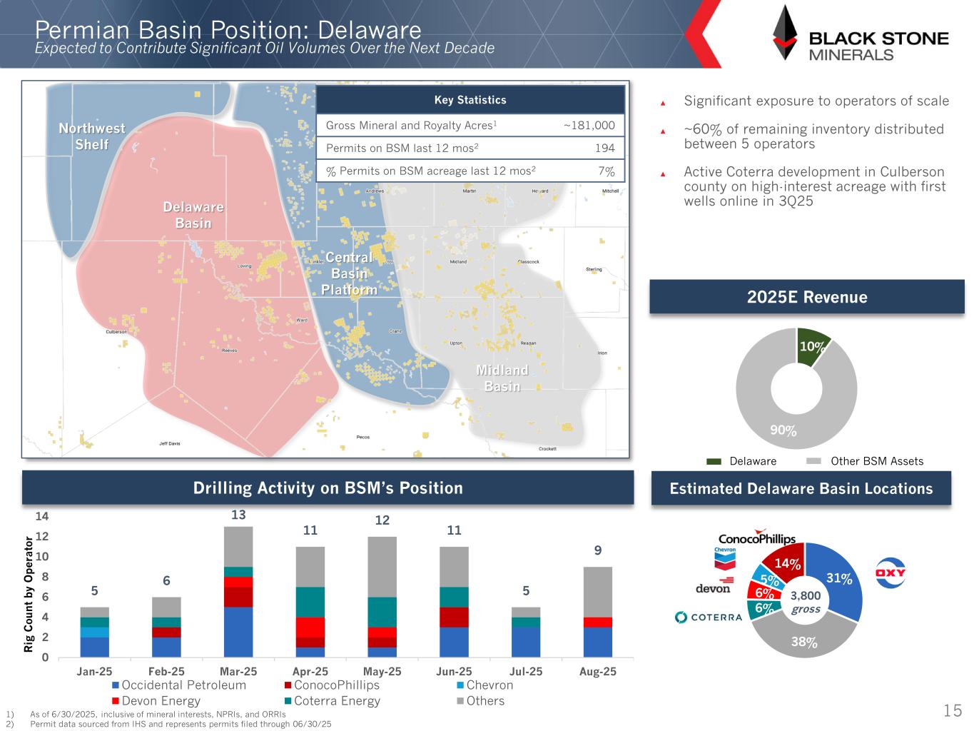 12% 88% 8 8 7 6 6 6 10 10 9 12 7 7 9 14 15 8 20 26 17 21 21 30 39 27 0 5 10 15 20 25 30 35 40 45 Jan-25 Feb-25 Mar-25 Apr-25 May-25 Jun-25 Jul-25 Aug-25 Diamondback ExxonMobil ConocoPhillips Occidental Petroleum APA Corp Others Central Basin Platform Northwest Shelf Delaware Basin Midland Basin 2025E Revenue 14 ▲ Deep bench of inventory broadly distributed throughout the core of the basin ▲ Significant remaining inventory is anchored by Exxon and Diamondback, who have had a combined average of 17 rigs a month on BSM acreage in 2025 1) As of 6/30/2025, inclusive of mineral interests, NPRIs, and ORRIs 2) Permit data sourced from IHS and represents permits filed through 06/30/25 R ig C o u n t b y O p e ra to r Key Statistics Gross Mineral and Royalty Acres1 ~451,000 Permits on BSM last 12 mos2 445 % Permits on BSM acreage last 12 mos2 20% Drilling Activity on BSM’s Position Permian Basin Position: Midland Expected to Contribute Significant Oil Volumes Over the Next Decade 37% 19% 6% 6% 4% 28% 5,700 gross Estimated Midland Basin Locations Midland Other BSM Assets