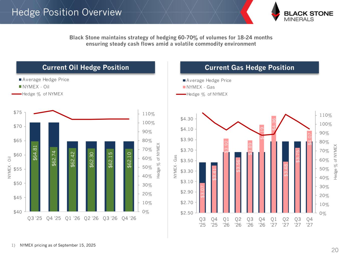 Hedge Position Overview 1) NYMEX pricing as of September 15, 2025 Black Stone maintains strategy of hedging 60-70% of volumes for 18-24 months ensuring steady cash flows amid a volatile commodity environment 20 $ . $ 2 . $ 2 . 2 $ 2 . 0 $ 2 . 5 $ 2 . 0 $ 0 $ 5 $50 $55 $ 0 $ 5 $ 0 $ 5 Q 25 Q 25 Q 2 Q2 2 Q 2 Q 2 N M E X O il Average Hedge Price N MEX Oil Average Hedge Price N MEX Gas Current Oil Hedge Position Current Gas Hedge Position Hedge of N MEX Hedge of N MEX $ .0 $ . $ . 2 $ .5 $ . $ . $ . $ . $ . 5 $ .0 $2.50 $2. 0 $2. 0 $ . 0 $ . 0 $ .50 $ . 0 $ . 0 $ . 0 $ . 0 Q 25 Q 25 Q 2 Q2 2 Q 2 Q 2 Q 2 Q2 2 Q 2 Q 2 N M E X G a s 0 0 20 0 0 50 0 0 0 0 00 0 H e d g e o f N M E X 0 0 20 0 0 50 0 0 0 0 00 0 H e d g e o f N M E X