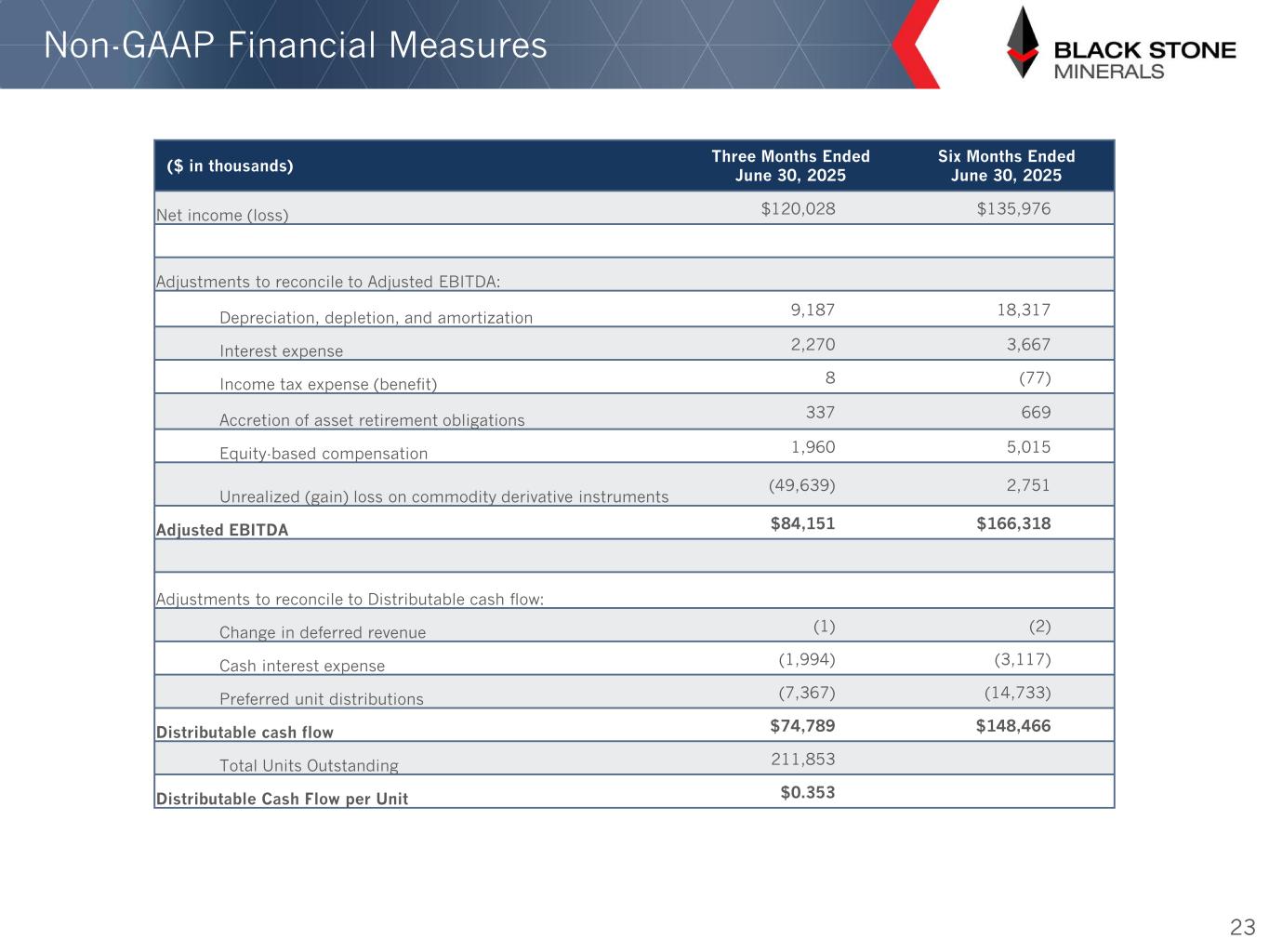 Non-GAAP Financial Measures ($ in thousands) Three Months Ended June 30, 2025 Six Months Ended June 30, 2025 Net income (loss) $120,028 $135,976 Adjustments to reconcile to Adjusted EBITDA: Depreciation, depletion, and amortization 9,187 18,317 Interest expense 2,270 3,667 Income tax expense (benefit) 8 (77) Accretion of asset retirement obligations 337 669 Equity-based compensation 1,960 5,015 Unrealized (gain) loss on commodity derivative instruments (49,639) 2,751 Adjusted EBITDA $84,151 $166,318 Adjustments to reconcile to Distributable cash flow: Change in deferred revenue (1) (2) Cash interest expense (1,994) (3,117) Preferred unit distributions (7,367) (14,733) Distributable cash flow $74,789 $148,466 Total Units Outstanding 211,853 Distributable Cash Flow per Unit $0.353 23