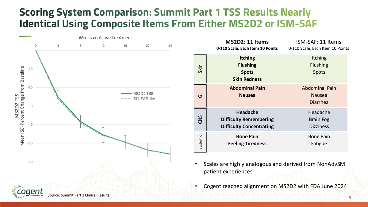 Scoring System Comparison: Summit Part 1 TSS Results Nearly Identical Using Composite Items From Either MS2D2 or ISM-SAF Weeks on Active Treatment MS2D2: 11 Items ISM-SAF: 11 Items 0 4 8 12 16 20 24 0-110 Scale, Each Item 10 Points 0-110 Scale, Each Item 10 Points 0 Itching Itching Flushing Flushing -10 Spots Spots Skin Redness -20 Abdominal Pain Abdominal Pain MS2D2 TSS Nausea Nausea ISM-SAF like Diarrhea -30 Headache Headache Difficulty Remembering Brain Fog -40 Difficulty Concentrating Dizziness Bone Pain Bone Pain -50 Feeling Tiredness Fatigue -60 • Scales are highly analogous and derived from NonAdvSM patient experiences • Cogent reached alignment on MS2D2 with FDA June 2024 Source: Summit Part 1 Clinical Results 8 MS2D2 TSS Mean (SE) Percent Change from Baseline Systemic CNS GI Skin
