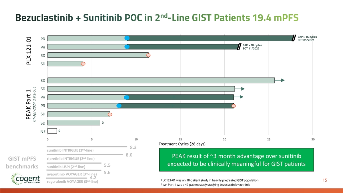 nd Bezuclastinib + Sunitinib POC in 2 -Line GIST Patients 19.4 mPFS EAP > 16 cycles PR EOT 05/2021 EAP > 38 cycles PR EOT 11/2022 SD SD SD SD PR PR SD Ω SD Ω NE 0 5 10 15 20 25 30 Treatment Cycles (28 days) 8.3 nd sunitinib INTRIGUE (2 -line) 8.0 PEAK result of ~3 month advantage over sunitinib nd ripretinib INTRIGUE (2 -line) GIST mPFS expected to be clinically meaningful for GIST patients nd 5.5 sunitinib USPI (2 -line) benchmarks 5.6 rd avapritinib VOYAGER (3 -line) 4.2 PLX 121-01​ was an 18-patient study in heavily pretreated GIST population 15 rd regorafenib VOYAGER (3 -line) Peak Part 1 was a 42-patient study studying bezuclastinib+sunitinib PEAK Part 1 PLX 121-01 01-Apr-2024 Data-cut