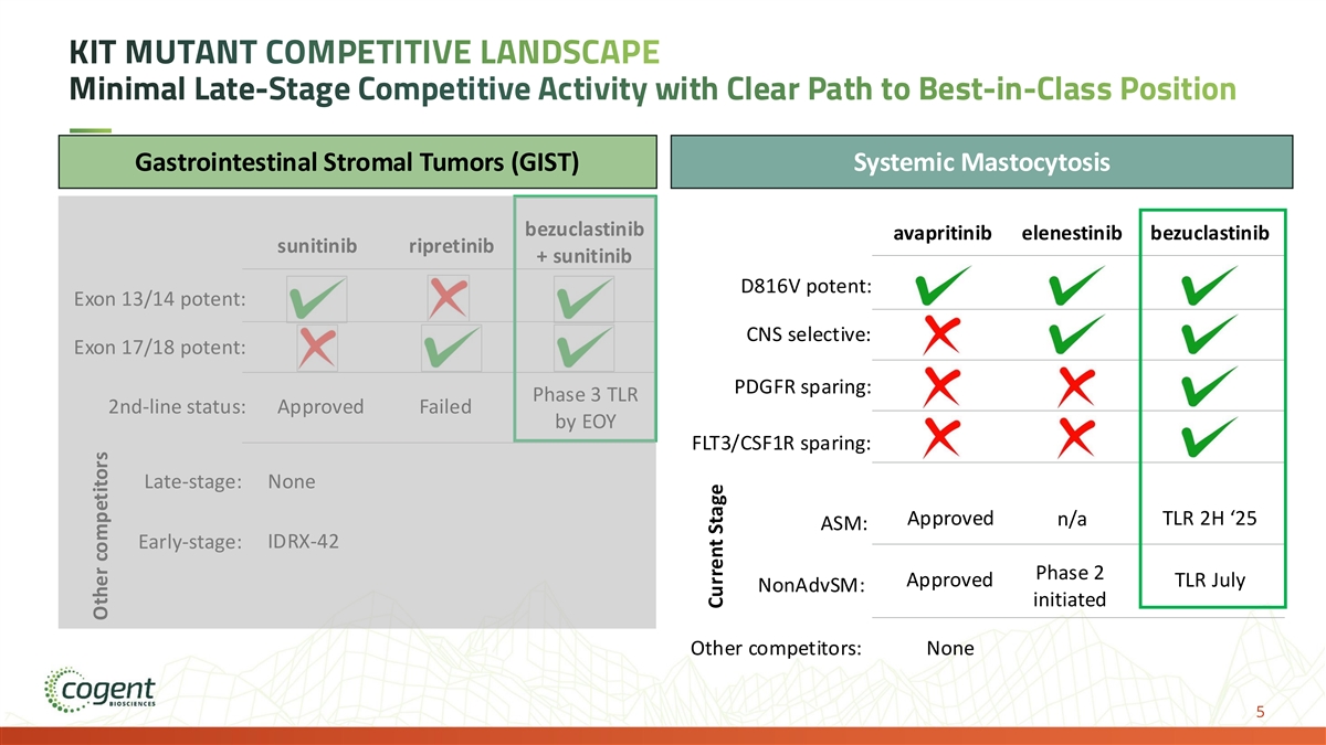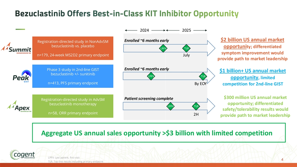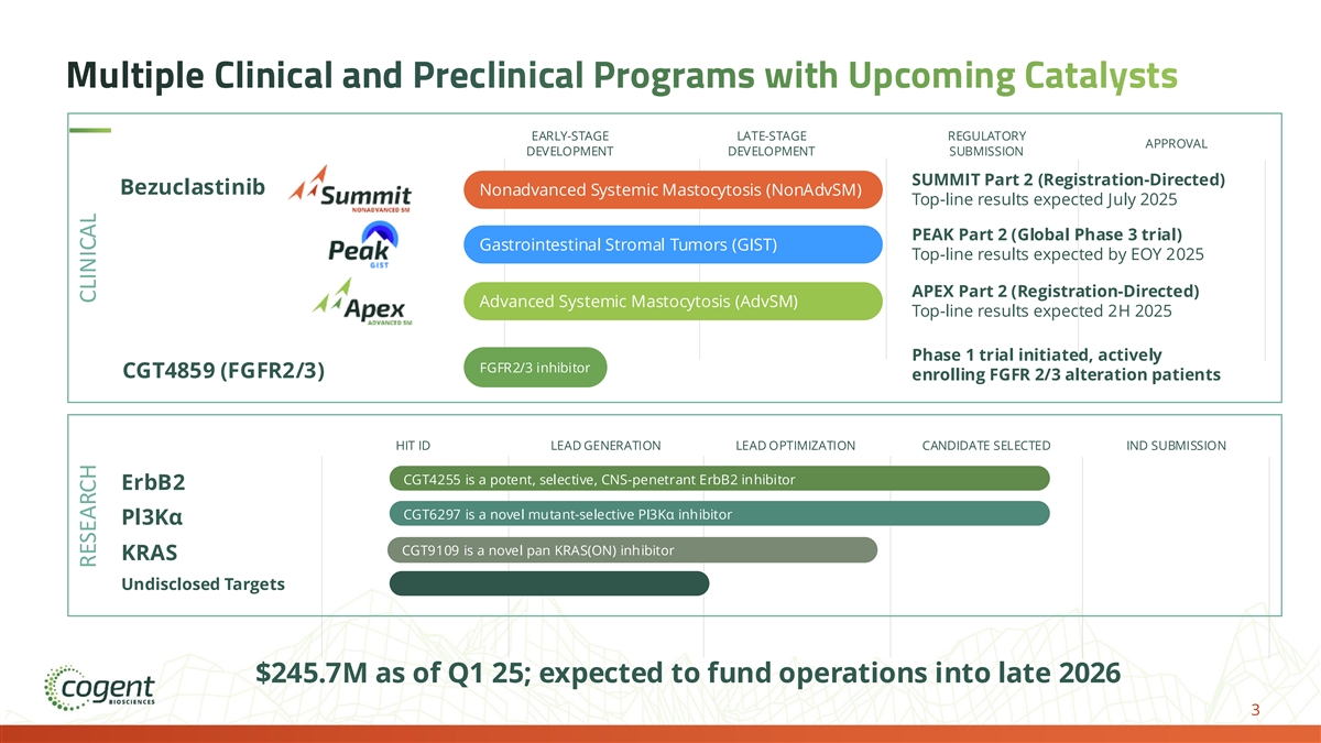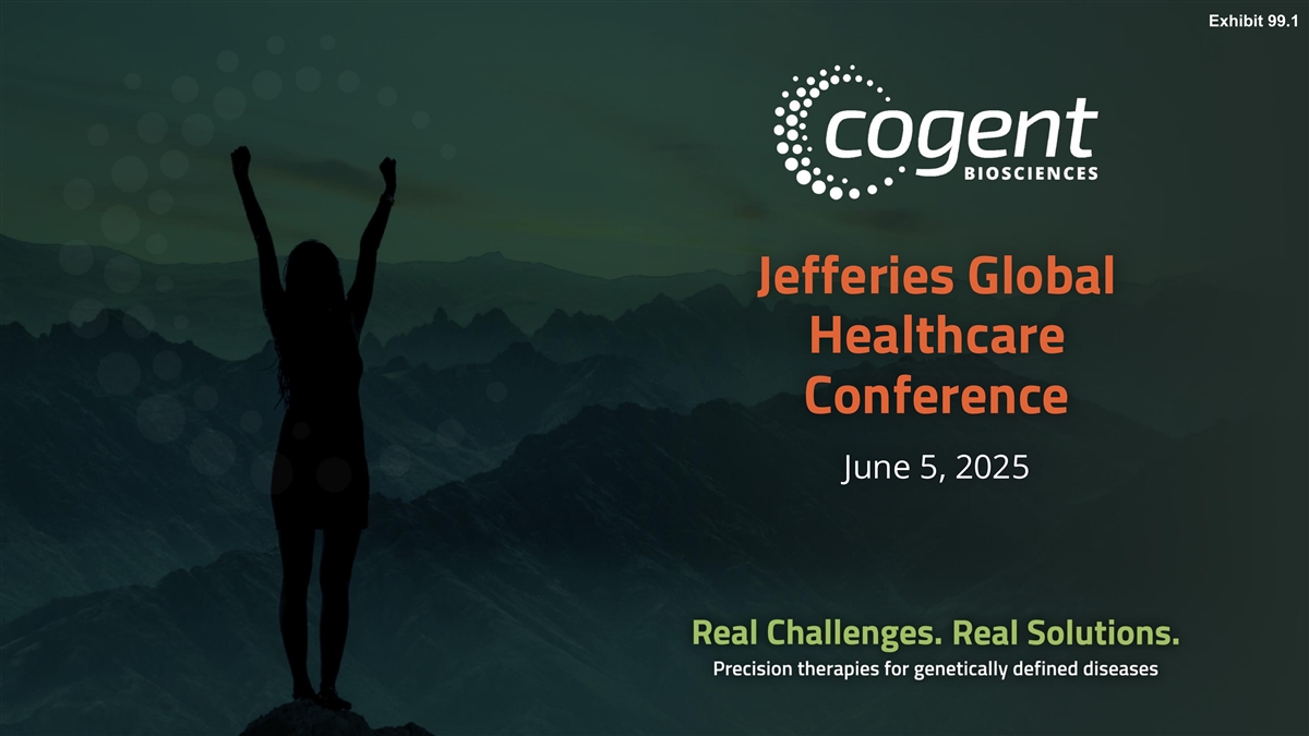 Forward-Looking Statements and Risk Factors The information contained in this presentation has been prepared by Cogent Biosciences, Inc. (“Cogent” or the “Company”) and contains information pertaining to the business and operations of the Company. The information contained in this presentation: (a) is provided as at the date hereof, is subject to change without notice, and is based on publicly available information, internally developed data as well as third party information from other sources; (b) does not purport to contain all the information that may be necessary or desirable to fully and accurately evaluate an investment in the Company; (c) is not to be considered as a recommendation by the Company that any person make an investment in the Company; (d) is for information purposes only and shall not constitute an offer to buy, sell, issue or subscribe for, or the solicitation of an offer to buy, sell or issue, or subscribe for any securities of the Company in any jurisdiction in which such offer, solicitation or sale would be unlawful. Where any opinion or belief is expressed in this presentation, it is based on certain assumptions and limitations and is an expression of present opinion or belief only. This presentation should not be construed as legal, financial or tax advice to any individual, as each individual’s circumstances are different. This document is for informational purposes only and should not be considered a solicitation or recommendation to purchase, sell or hold a security. This presentation and the accompanying oral commentary contain forward-looking statements that involve risks, uncertainties and assumptions. If the risks or uncertainties ever materialize or the assumptions prove incorrect, our results may differ materially from those expressed or implied by such forward looking statements. All statements other than statements of historical fact could be deemed forward-looking, including, but not limited to, any statements of the plans, strategies, and objectives of management for future operations, including our clinical development and commercialization plans; any projections of financial information; any statement about historical results that may suggest trends for our business; any statement of expectation or belief regarding future events; potential markets or market size, technology developments, our clinical product pipeline, clinical and pre-clinical data or the implications thereof, enforceability of our intellectual property rights, competitive strengths or our position within the industry; any statements regarding the anticipated benefits of our collaborations or other strategic transactions; and any statements of assumptions underlying any of the items mentioned. These statements are based on estimates and information available to us at the time of this presentation and are not guarantees of future performance. Actual results could differ materially from our current expectations as a result of many risks and uncertainties, including but not limited to, risks associated with: the potential impacts of raising additional capital, including dilution to our existing stockholders, restrictions on our operations or requirements that we relinquish rights to our technologies or product candidates; the success, cost, and timing of our product development activities and clinical trials; the timing of our planned regulatory submissions to the FDA for our product candidate bezuclastinib and feedback from the FDA as to our plans; our ability to obtain and maintain regulatory approval for our bezuclastinib product candidate and any other product candidates we may develop, and any related restrictions, limitations, and/or warnings in the label of an approved product candidate; the potential for our identified research priorities to advance our bezuclastinib product candidate; the ability to license additional intellectual property relating to our product candidates from third parties and to comply with our existing license agreements and collaboration agreements; the ability and willingness of our third-party research institution collaborators to continue research and development activities relating to our product candidates; our ability to commercialize our products in light of the intellectual property rights of others; our ability to obtain funding for our operations, including funding necessary to complete further development and commercialization of our product candidates; the scalability and commercial viability of our manufacturing methods and processes; the commercialization of our product candidates, if approved; our plans to research, develop, and commercialize our product candidates; our ability to attract collaborators with development, regulatory, and commercialization expertise; our expectations regarding our ability to obtain and maintain intellectual property protection for our product candidates; business interruptions resulting from public health crises, which could cause a disruption of the development of our product candidates and adversely impact our business; and the fact that interim clinical data may not be indicative of future results, among others. For a further description of the risks and uncertainties that could cause actual results to differ from those expressed in these forward-looking statements, as well as risks relating to our business in general, see our periodic filings filed from time to time with the Securities and Exchange Commission. Unless as required by law, we assume no obligation and do not intend to update these forward-looking statements or to conform these statements to actual results or to changes in our expectations. All of Cogent’s product candidates are investigational product candidates and their safety and efficacy have not yet been established. Cogent has not obtained marketing approval for any product, and there is no certainty that any marketing approvals will be obtained or as to the timelines on w