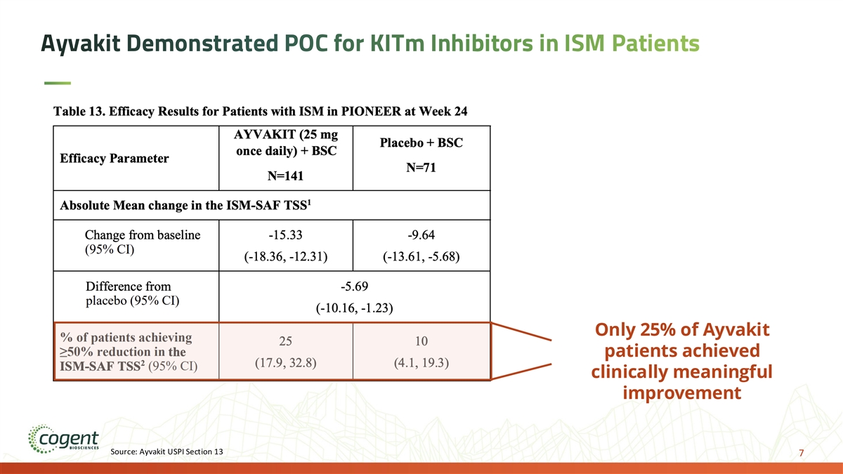 Ayvakit Demonstrated POC for KITm Inhibitors in ISM Patients Only 25% of Ayvakit patients achieved clinically meaningful improvement Source: Ayvakit USPI Section 13 7