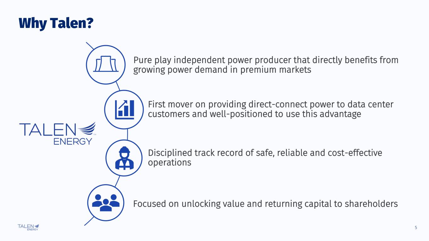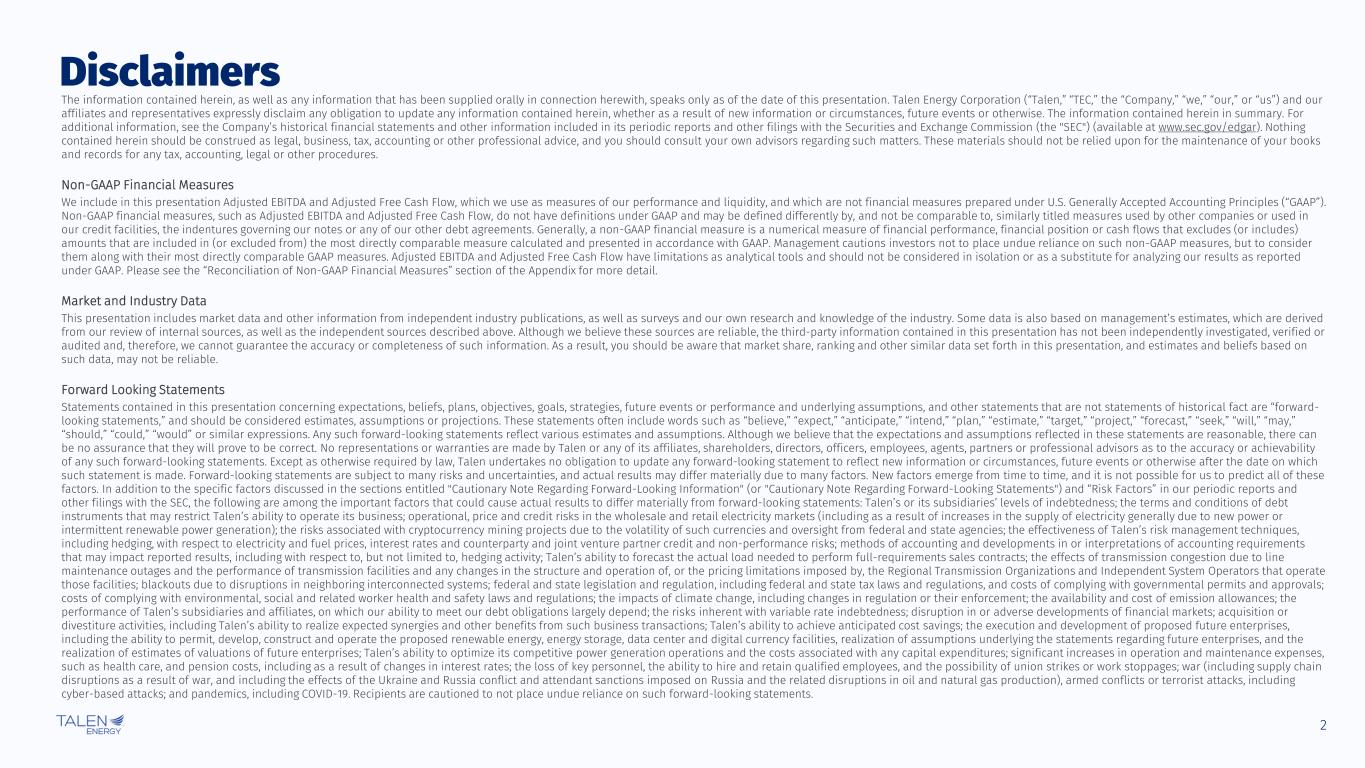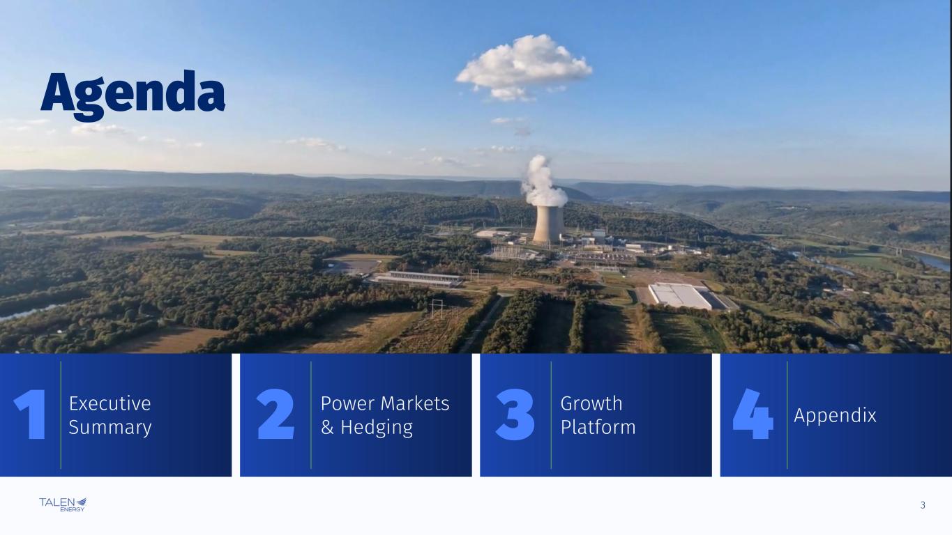 2 Disclaimers The information contained herein, as well as any information that has been supplied orally in connection herewith, speaks only as of the date of this presentation. Talen Energy Corporation (“Talen,” “TEC,” the “Company,” “we,” “our,” or “us”) and our affiliates and representatives expressly disclaim any obligation to update any information contained herein, whether as a result of new information or circumstances, future events or otherwise. The information contained herein in summary. For additional information, see the Company’s historical financial statements and other information included in its periodic reports and other filings with the Securities and Exchange Commission (the "SEC") (available at www.sec.gov/edgar). Nothing contained herein should be construed as legal, business, tax, accounting or other professional advice, and you should consult your own advisors regarding such matters. These materials should not be relied upon for the maintenance of your books and records for any tax, accounting, legal or other procedures. Non-GAAP Financial Measures We include in this presentation Adjusted EBITDA and Adjusted Free Cash Flow, which we use as measures of our performance and liquidity, and which are not financial measures prepared under U.S. Generally Accepted Accounting Principles (“GAAP”). Non-GAAP financial measures, such as Adjusted EBITDA and Adjusted Free Cash Flow, do not have definitions under GAAP and may be defined differently by, and not be comparable to, similarly titled measures used by other companies or used in our credit facilities, the indentures governing our notes or any of our other debt agreements. Generally, a non-GAAP financial measure is a numerical measure of financial performance, financial position or cash flows that excludes (or includes) amounts that are included in (or excluded from) the most directly comparable measure calculated and presented in accordance with GAAP. Management cautions investors not to place undue reliance on such non-GAAP measures, but to consider them along with their most directly comparable GAAP measures. Adjusted EBITDA and Adjusted Free Cash Flow have limitations as analytical tools and should not be considered in isolation or as a substitute for analyzing our results as reported under GAAP. Please see the “Reconciliation of Non-GAAP Financial Measures” section of the Appendix for more detail. Market and Industry Data This presentation includes market data and other information from independent industry publications, as well as surveys and our own research and knowledge of the industry. Some data is also based on management’s estimates, which are derived from our review of internal sources, as well as the independent sources described above. Although we believe these sources are reliable, the third-party information contained in this presentation has not been independently investigated, verified or audited and, therefore, we cannot guarantee the accuracy or completeness of such information. As a result, you should be aware that market share, ranking and other similar data set forth in this presentation, and estimates and beliefs based on such data, may not be reliable. Forward Looking Statements Statements contained in this presentation concerning expectations, beliefs, plans, objectives, goals, strategies, future events or performance and underlying assumptions, and other statements that are not statements of historical fact are “forward- looking statements,” and should be considered estimates, assumptions or projections. These statements often include words such as “believe,” “expect,” “anticipate,” “intend,” “plan,” “estimate,” “target,” “project,” “forecast,” “seek,” “will,” “may,” “should,” “could,” “would” or similar expressions. Any such forward-looking statements reflect various estimates and assumptions. Although we believe that the expectations and assumptions reflected in these statements are reasonable, there can be no assurance that they will prove to be correct. No representations or warranties are made by Talen or any of its affiliates, shareholders, directors, officers, employees, agents, partners or professional advisors as to the accuracy or achievability of any such forward-looking statements. Except as otherwise required by law, Talen undertakes no obligation to update any forward-looking statement to reflect new information or circumstances, future events or otherwise after the date on which such statement is made. Forward-looking statements are subject to many risks and uncertainties, and actual results may differ materially due to many factors. New factors emerge from time to time, and it is not possible for us to predict all of these factors. In addition to the specific factors discussed in the sections entitled "Cautionary Note Regarding Forward-Looking Information" (or "Cautionary Note Regarding Forward-Looking Statements") and “Risk Factors” in our periodic reports and other filings with the SEC, the following are among the important factors that could cause actual results to differ materially from forward-looking statements: Talen’s or its subsidiaries’ levels of indebtedness; the terms and conditions of debt instruments that may restrict Talen’s ability to operate its business; operational, price and credit risks in the wholesale and retail electricity markets (including as a result of increases in the supply of electricity generally due to new power or intermittent renewable power generation); the risks associated with cryptocurrency mining projects due to the volatility of such currencies and oversight from federal and state agencies; the effectiveness of Talen’s risk management techniques, including hedging, with respect to electricity and fuel prices, interest rates and counterparty and joint venture partner credit and non-performance risks; methods of accounting and dev