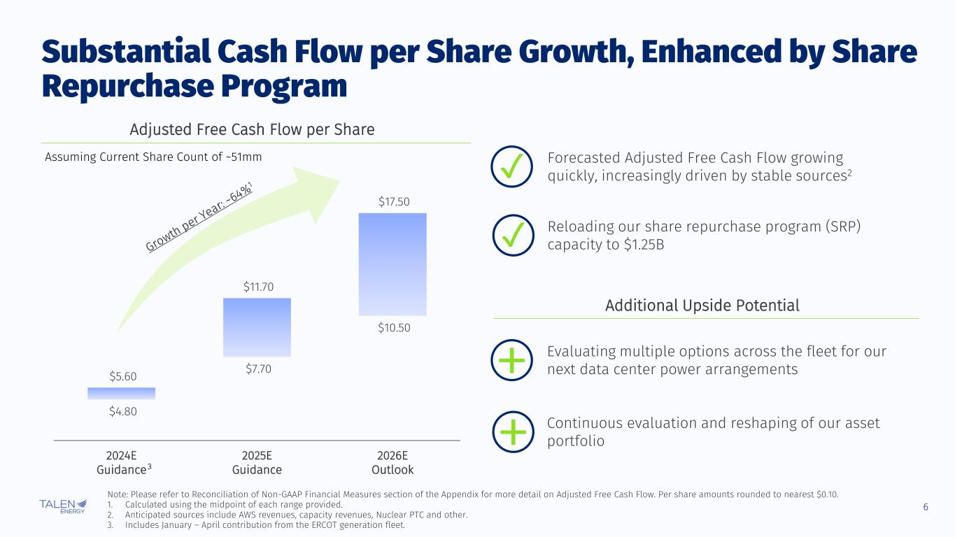 5 Pure play independent power producer that directly benefits from growing power demand in premium markets Disciplined track record of safe, reliable and cost-effective operations Why Talen? Focused on unlocking value and returning capital to shareholders First mover on providing direct-connect power to data center customers and well-positioned to use this advantage