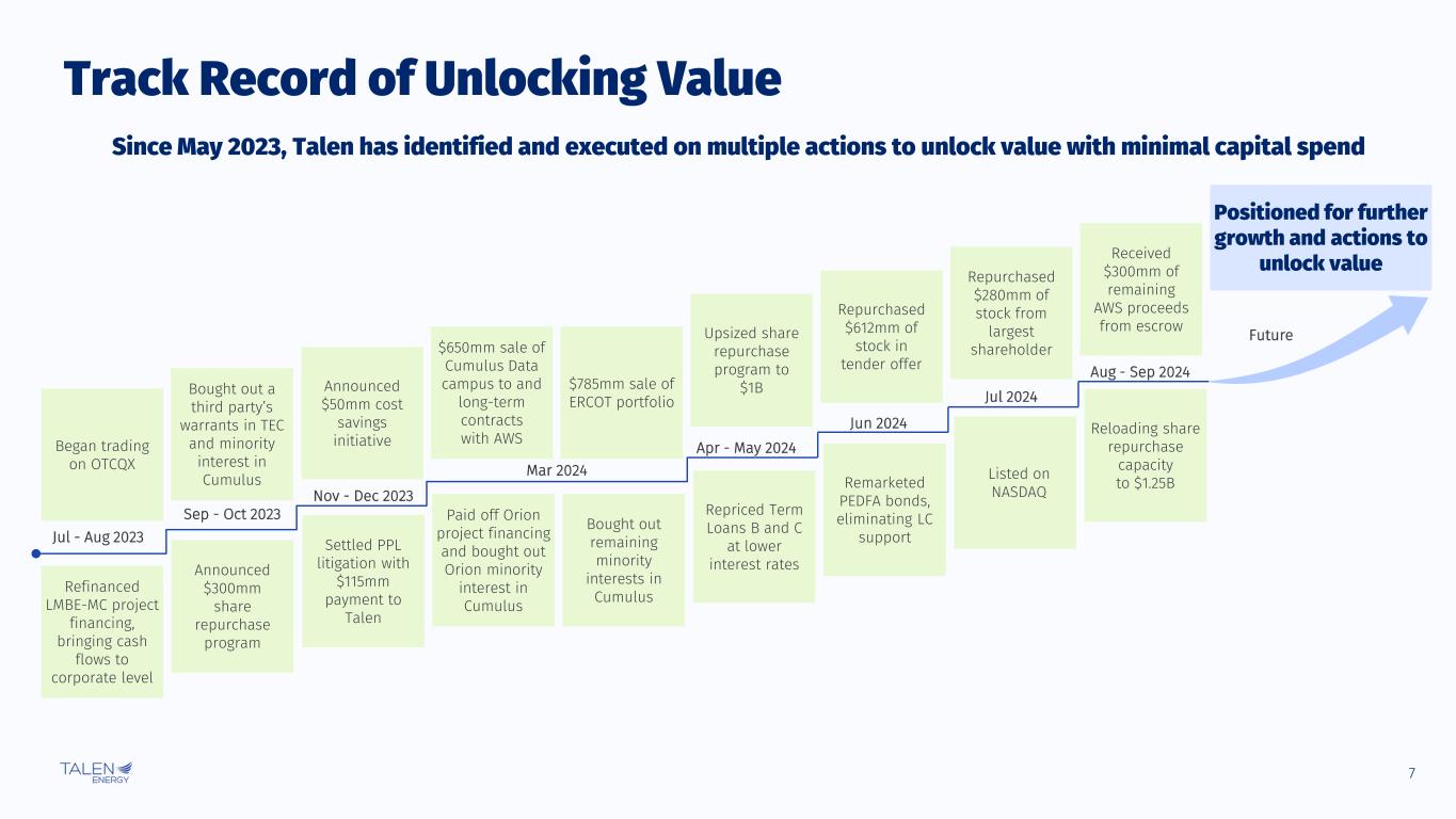 6 $4.80 $7.70 $10.50 $5.60 $11.70 $17.50 2024E Guidance 2025E Guidance 2026E Outlook Substantial Cash Flow per Share Growth, Enhanced by Share Repurchase Program Adjusted Free Cash Flow per Share Forecasted Adjusted Free Cash Flow growing quickly, increasingly driven by stable sources2 Reloading our share repurchase program (SRP) capacity to $1.25B ✓ ✓ Evaluating multiple options across the fleet for our next data center power arrangements+ Continuous evaluation and reshaping of our asset portfolio+ Additional Upside Potential 3 Note: Please refer to Reconciliation of Non-GAAP Financial Measures section of the Appendix for more detail on Adjusted Free Cash Flow. Per share amounts rounded to nearest $0.10. 1. Calculated using the midpoint of each range provided. 2. Anticipated sources include AWS revenues, capacity revenues, Nuclear PTC and other. 3. Includes January – April contribution from the ERCOT generation fleet. Assuming Current Share Count of ~51mm