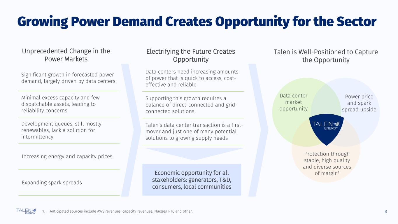 7 Track Record of Unlocking Value Since May 2023, Talen has identified and executed on multiple actions to unlock value with minimal capital spend Future Announced $50mm cost savings initiative Settled PPL litigation with $115mm payment to Talen $650mm sale of Cumulus Data campus to and long-term contracts with AWS $785mm sale of ERCOT portfolio Upsized share repurchase program to $1B Repurchased $612mm of stock in tender offer Repurchased $280mm of stock from largest shareholder Listed on NASDAQ Announced $300mm share repurchase program Began trading on OTCQX Jul - Aug 2023 Refinanced LMBE-MC project financing, bringing cash flows to corporate level Sep - Oct 2023 Bought out a third party’s warrants in TEC and minority interest in Cumulus Nov - Dec 2023 Mar 2024 Paid off Orion project financing and bought out Orion minority interest in Cumulus Bought out remaining minority interests in Cumulus Apr - May 2024 Repriced Term Loans B and C at lower interest rates Jun 2024 Remarketed PEDFA bonds, eliminating LC support Jul 2024 Aug - Sep 2024 Reloading share repurchase capacity to $1.25B Positioned for further growth and actions to unlock valueReceived $300mm of remaining AWS proceeds from escrow