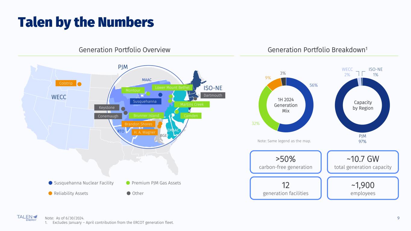 8 Growing Power Demand Creates Opportunity for the Sector Significant growth in forecasted power demand, largely driven by data centers Minimal excess capacity and few dispatchable assets, leading to reliability concerns Development queues, still mostly renewables, lack a solution for intermittency Increasing energy and capacity prices Expanding spark spreads Unprecedented Change in the Power Markets Electrifying the Future Creates Opportunity Talen is Well-Positioned to Capture the Opportunity Protection through stable, high quality and diverse sources of margin1 Data center market opportunity Power price and spark spread upside Data centers need increasing amounts of power that is quick to access, cost- effective and reliable Supporting this growth requires a balance of direct-connected and grid- connected solutions Talen’s data center transaction is a first- mover and just one of many potential solutions to growing supply needs Economic opportunity for all stakeholders: generators, T&D, consumers, local communities 1. Anticipated sources include AWS revenues, capacity revenues, Nuclear PTC and other.
