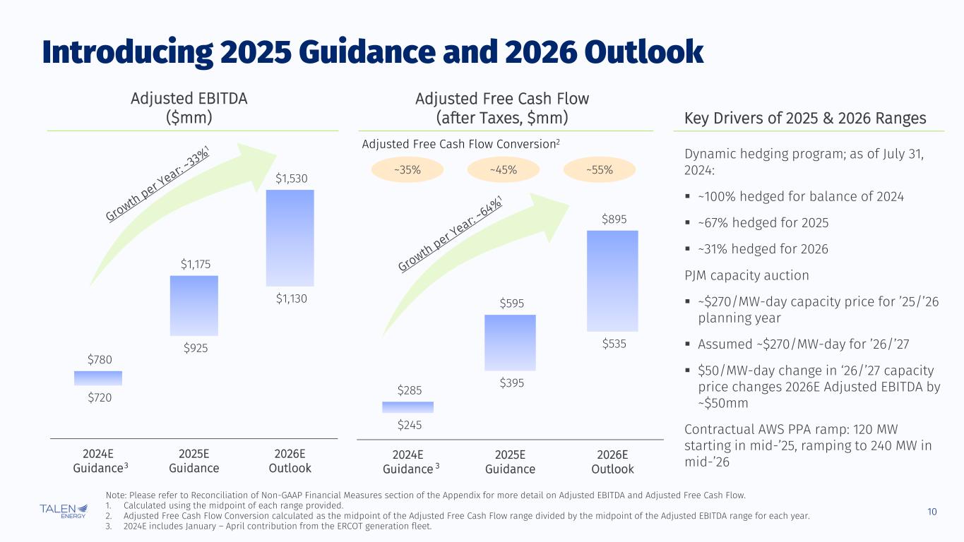 9 >50% carbon-free generation ~10.7 GW total generation capacity 12 generation facilities ~1,900 employees 1H 2024 Generation Mix Generation Portfolio Breakdown1 56% 32% 9% 3% Generation Portfolio Overview ISO-NE Dartmouth Colstrip MAAC EMAAC Lower Mount Bethel Martins Creek Keystone Conemaugh Brunner Island RTO WECC Brandon Shores H. A. Wagner Montour Camden Susquehanna Susquehanna Nuclear Facility Premium PJM Gas Assets OtherReliability Assets PJM BGE Capacity by Region PJM 97% WECC 2% ISO-NE 1% Note: Same legend as the map. Talen by the Numbers Note: As of 6/30/2024. 1. Excludes January – April contribution from the ERCOT generation fleet.