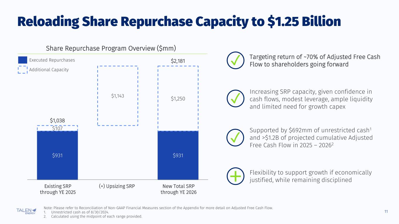 10 $245 $395 $535 $285 $595 $895 2024E Guidance 2025E Guidance 2026E Outlook $720 $925 $1,130 $780 $1,175 $1,530 2024E Guidance 2025E Guidance 2026E Outlook Introducing 2025 Guidance and 2026 Outlook Note: Please refer to Reconciliation of Non-GAAP Financial Measures section of the Appendix for more detail on Adjusted EBITDA and Adjusted Free Cash Flow. 1. Calculated using the midpoint of each range provided. 2. Adjusted Free Cash Flow Conversion calculated as the midpoint of the Adjusted Free Cash Flow range divided by the midpoint of the Adjusted EBITDA range for each year. 3. 2024E includes January – April contribution from the ERCOT generation fleet. Adjusted EBITDA ($mm) Adjusted Free Cash Flow (after Taxes, $mm) ~35% ~45% ~55% Adjusted Free Cash Flow Conversion2 Dynamic hedging program; as of July 31, 2024: ▪ ~100% hedged for balance of 2024 ▪ ~67% hedged for 2025 ▪ ~31% hedged for 2026 PJM capacity auction ▪ ~$270/MW-day capacity price for ’25/’26 planning year ▪ Assumed ~$270/MW-day for ’26/’27 ▪ $50/MW-day change in ‘26/’27 capacity price changes 2026E Adjusted EBITDA by ~$50mm Contractual AWS PPA ramp: 120 MW starting in mid-’25, ramping to 240 MW in mid-’26 Key Drivers of 2025 & 2026 Ranges 3 3