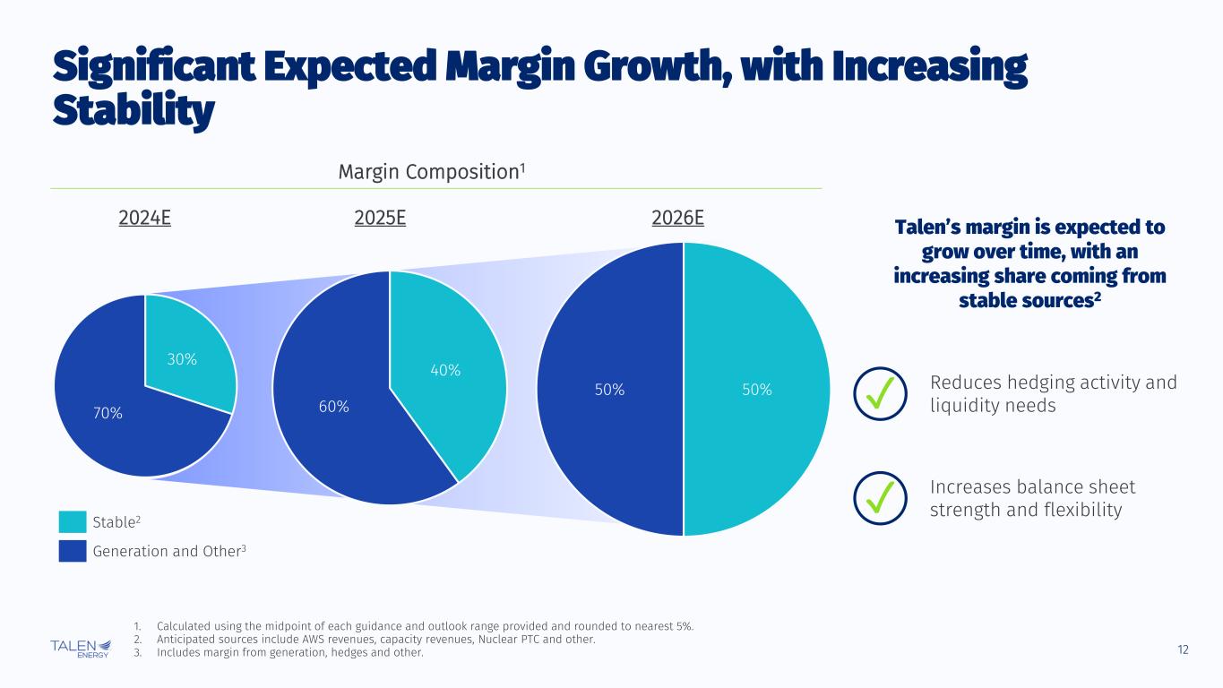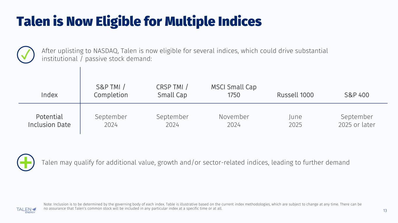 12 50%50% 28% 72% Significant Expected Margin Growth, with Increasing Stability 2024E 2025E 2026E Generation and Other3 Stable2 1. Calculated using the midpoint of each guidance and outlook range provided and rounded to nearest 5%. 2. Anticipated sources include AWS revenues, capacity revenues, Nuclear PTC and other. 3. Includes margin from generation, hedges and other. Talen’s margin is expected to grow over time, with an increasing share coming from stable sources2 Reduces hedging activity and liquidity needs Increases balance sheet strength and flexibility ✓ ✓ Margin Composition1 30% 70% 40% 60%