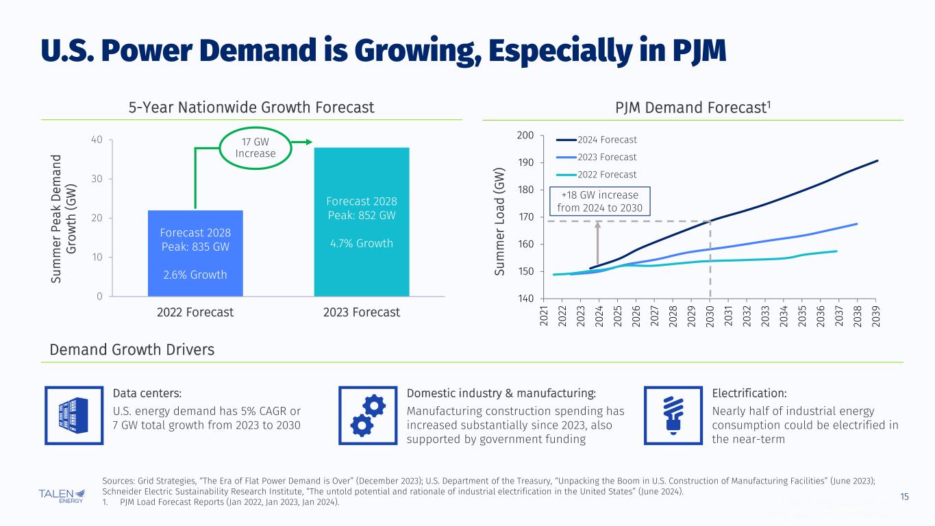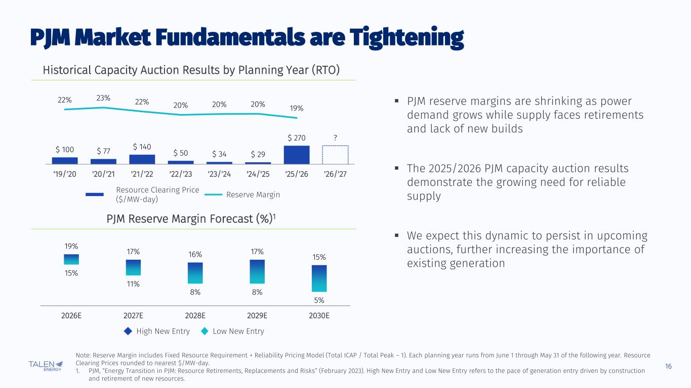 15 © Talen Energy Corporation Proprietary and Confidential Sources: Grid Strategies, “The Era of Flat Power Demand is Over” (December 2023); U.S. Department of the Treasury, “Unpacking the Boom in U.S. Construction of Manufacturing Facilities” (June 2023); Schneider Electric Sustainability Research Institute, “The untold potential and rationale of industrial electrification in the United States” (June 2024). 1. PJM Load Forecast Reports (Jan 2022, Jan 2023, Jan 2024). 5-Year Nationwide Growth Forecast PJM Demand Forecast1 U.S. Power Demand is Growing, Especially in PJM 140 150 160 170 180 190 200 20 21 20 22 20 23 20 24 20 25 20 26 20 27 20 28 20 29 20 30 20 31 20 32 20 33 20 34 20 35 20 36 20 37 20 38 20 39 Su m m er L oa d (G W ) 2024 Forecast 2023 Forecast 2022 Forecast +18 GW increase from 2024 to 2030 Demand Growth Drivers Forecast 2028 Peak: 835 GW 2.6% Growth Forecast 2028 Peak: 852 GW 4.7% Growth 0 10 20 30 40 2022 Forecast 2023 Forecast Su m m er P ea k D em an d G ro w th (G W ) 17 GW Increase Domestic industry & manufacturing: Manufacturing construction spending has increased substantially since 2023, also supported by government funding Electrification: Nearly half of industrial energy consumption could be electrified in the near-term Data centers: U.S. energy demand has 5% CAGR or 7 GW total growth from 2023 to 2030