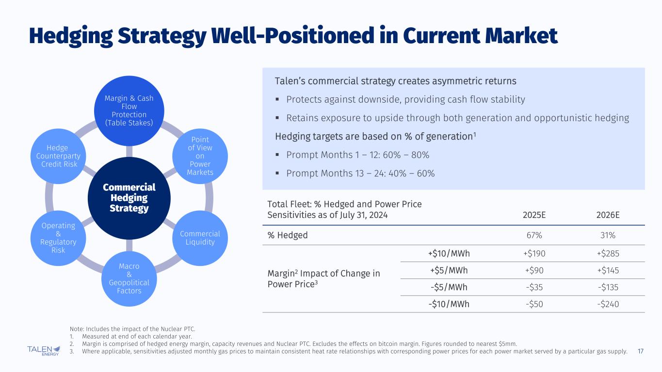 16 PJM Market Fundamentals are Tightening Note: Reserve Margin includes Fixed Resource Requirement + Reliability Pricing Model (Total ICAP / Total Peak – 1). Each planning year runs from June 1 through May 31 of the following year. Resource Clearing Prices rounded to nearest $/MW-day. 1. PJM, “Energy Transition in PJM: Resource Retirements, Replacements and Risks” (February 2023). High New Entry and Low New Entry refers to the pace of generation entry driven by construction and retirement of new resources. Resource Clearing Price ($/MW-day) Reserve Margin Historical Capacity Auction Results by Planning Year (RTO) PJM Reserve Margin Forecast (%)1 Low New EntryHigh New Entry ▪ PJM reserve margins are shrinking as power demand grows while supply faces retirements and lack of new builds ▪ The 2025/2026 PJM capacity auction results demonstrate the growing need for reliable supply ▪ We expect this dynamic to persist in upcoming auctions, further increasing the importance of existing generation 15% 11% 8% 8% 5% 19% 17% 16% 17% 15% 2026E 2027E 2028E 2029E 2030E $ 100 $ 77 $ 140 $ 50 $ 34 $ 29 $ 270 ? 22% 23% 22% 20% 20% 20% 19% '19/'20 '20/'21 '21/'22 '22/'23 '23/'24 '24/'25 '25/'26 '26/'27