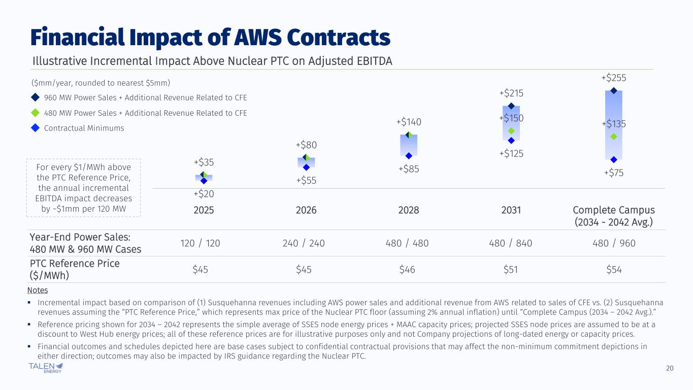 19 Long-Term Agreements with AWS Create Stable Cash Flow Growth Progress Update ▪ Susquehanna PPA for up to 960 MW direct-connect, carbon-free power ▪ Increasing by 120 MW in commitments per year, with option to accelerate power ramp ▪ Fixed price over 10-year terms, repriced at market ▪ Additional revenue from carbon-free energy sales (CFE) Overview of AWS Contracts ✓ May 2024: Township zoning changes approved for data center use ✓ Jun 2024: Building permit received to fit-out existing data center shell ✓ Jul 2024: Master Site Plan approved; unlocks full campus development ✓ Aug 2024: $300mm escrow released