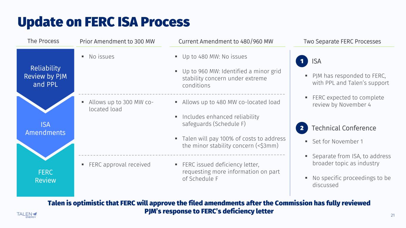 20 Financial Impact of AWS Contracts ($mm/year, rounded to nearest $5mm) Contractual Minimums 480 MW Power Sales + Additional Revenue Related to CFE 960 MW Power Sales + Additional Revenue Related to CFE Illustrative Incremental Impact Above Nuclear PTC on Adjusted EBITDA Notes ▪ Incremental impact based on comparison of (1) Susquehanna revenues including AWS power sales and additional revenue from AWS related to sales of CFE vs. (2) Susquehanna revenues assuming the “PTC Reference Price,” which represents max price of the Nuclear PTC floor (assuming 2% annual inflation) until “Complete Campus (2034 – 2042 Avg.).” ▪ Reference pricing shown for 2034 – 2042 represents the simple average of SSES node energy prices + MAAC capacity prices; projected SSES node prices are assumed to be at a discount to West Hub energy prices; all of these reference prices are for illustrative purposes only and not Company projections of long-dated energy or capacity prices. ▪ Financial outcomes and schedules depicted here are base cases subject to confidential contractual provisions that may affect the non-minimum commitment depictions in either direction; outcomes may also be impacted by IRS guidance regarding the Nuclear PTC. Year-End Power Sales: 480 MW & 960 MW Cases 120 / 120 240 / 240 480 / 480 480 / 840 480 / 960 PTC Reference Price ($/MWh) $45 $45 $46 $51 $54 +$20 +$55 +$85 +$125 +$75 +$35 +$80 +$140 +$215 +$255 +$150 +$135 2025 2026 2028 2031 Complete Campus (2034 - 2042 Avg.) For every $1/MWh above the PTC Reference Price, the annual incremental EBITDA impact decreases by ~$1mm per 120 MW
