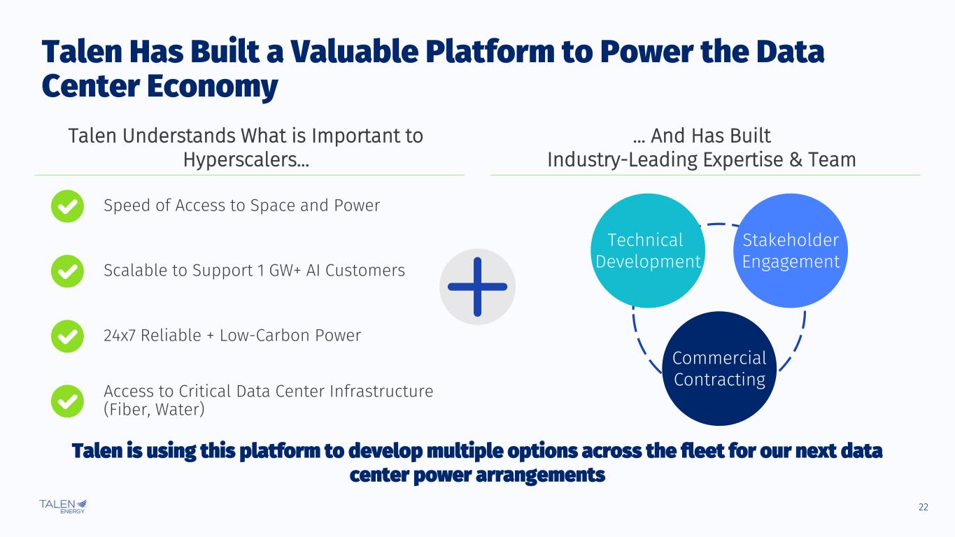 21 Update on FERC ISA Process Reliability Review by PJM and PPL ISA Amendments FERC Review Prior Amendment to 300 MW Current Amendment to 480/960 MW Two Separate FERC Processes ▪ Allows up to 300 MW co- located load ▪ Allows up to 480 MW co-located load ▪ Includes enhanced reliability safeguards (Schedule F) ▪ Talen will pay 100% of costs to address the minor stability concern (<$3mm) ▪ No issues ▪ Up to 480 MW: No issues ▪ Up to 960 MW: Identified a minor grid stability concern under extreme conditions ▪ FERC approval received ▪ FERC issued deficiency letter, requesting more information on part of Schedule F 1 ISA 2 Technical Conference ▪ PJM has responded to FERC, with PPL and Talen’s support ▪ FERC expected to complete review by November 4 ▪ Set for November 1 ▪ Separate from ISA, to address broader topic as industry ▪ No specific proceedings to be discussed Talen is optimistic that FERC will approve the filed amendments after the Commission has fully reviewed PJM’s response to FERC’s deficiency letter The Process