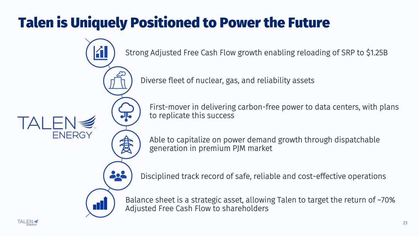 22 Talen Has Built a Valuable Platform to Power the Data Center Economy Talen Understands What is Important to Hyperscalers… … And Has Built Industry-Leading Expertise & Team Speed of Access to Space and Power Scalable to Support 1 GW+ AI Customers 24x7 Reliable + Low-Carbon Power Access to Critical Data Center Infrastructure (Fiber, Water) Technical Development Stakeholder Engagement Commercial Contracting Talen is using this platform to develop multiple options across the fleet for our next data center power arrangements