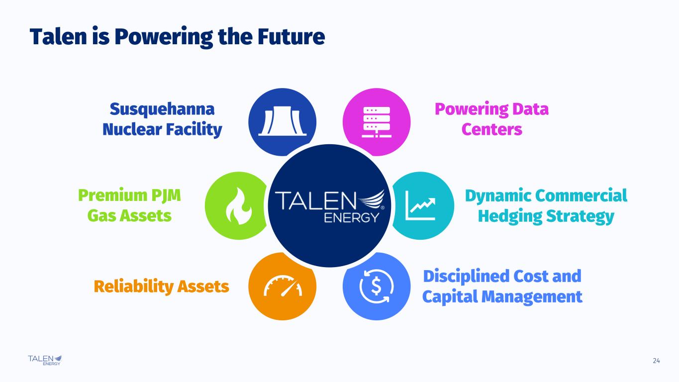 24 Talen is Powering the Future Reliability Assets Premium PJM Gas Assets Disciplined Cost and Capital Management Powering Data Centers Susquehanna Nuclear Facility Dynamic Commercial Hedging Strategy