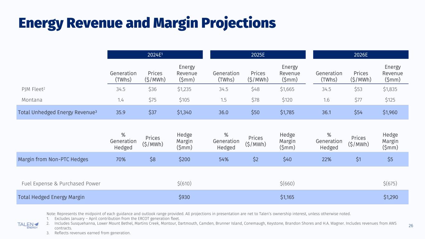 23 Talen is Uniquely Positioned to Power the Future Diverse fleet of nuclear, gas, and reliability assets Able to capitalize on power demand growth through dispatchable generation in premium PJM market Disciplined track record of safe, reliable and cost-effective operations First-mover in delivering carbon-free power to data centers, with plans to replicate this success Balance sheet is a strategic asset, allowing Talen to target the return of ~70% Adjusted Free Cash Flow to shareholders Strong Adjusted Free Cash Flow growth enabling reloading of SRP to $1.25B