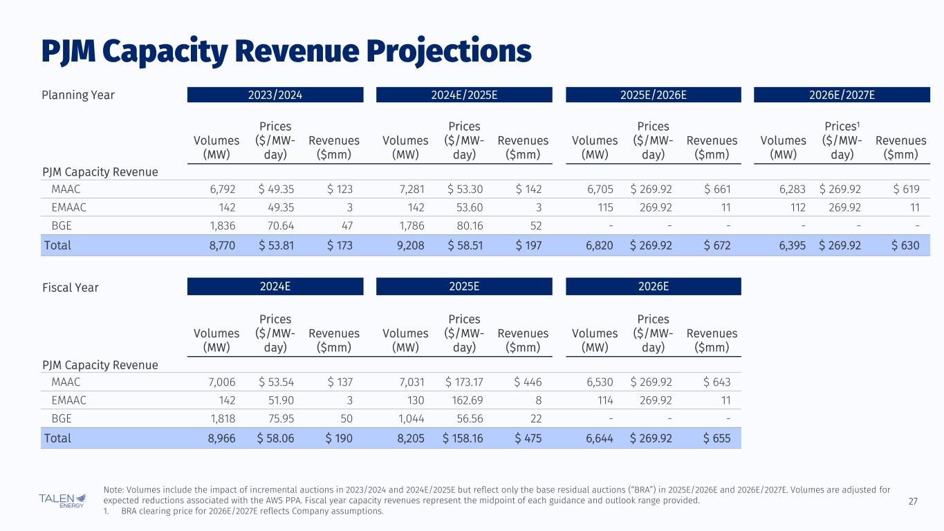 26 2024E1 2025E 2026E Generation (TWhs) Prices ($/MWh) Energy Revenue ($mm) Generation (TWhs) Prices ($/MWh) Energy Revenue ($mm) Generation (TWhs) Prices ($/MWh) Energy Revenue ($mm) PJM Fleet2 34.5 $36 $1,235 34.5 $48 $1,665 34.5 $53 $1,835 Montana 1.4 $75 $105 1.5 $78 $120 1.6 $77 $125 Total Unhedged Energy Revenue3 35.9 $37 $1,340 36.0 $50 $1,785 36.1 $54 $1,960 % Generation Hedged Prices ($/MWh) Hedge Margin ($mm) % Generation Hedged Prices ($/MWh) Hedge Margin ($mm) % Generation Hedged Prices ($/MWh) Hedge Margin ($mm) Margin from Non-PTC Hedges 70% $8 $200 54% $2 $40 22% $1 $5 Fuel Expense & Purchased Power $(610) $(660) $(675) Total Hedged Energy Margin $930 $1,165 $1,290 Note: Represents the midpoint of each guidance and outlook range provided. All projections in presentation are net to Talen’s ownership interest, unless otherwise noted. 1. Excludes January – April contribution from the ERCOT generation fleet. 2. Includes Susquehanna, Lower Mount Bethel, Martins Creek, Montour, Dartmouth, Camden, Brunner Island, Conemaugh, Keystone, Brandon Shores and H.A. Wagner. Includes revenues from AWS contracts. 3. Reflects revenues earned from generation. Energy Revenue and Margin Projections