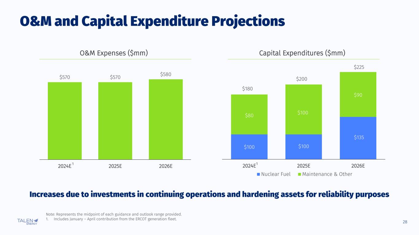 27 Planning Year 2023/2024 2024E/2025E 2025E/2026E 2026E/2027E Volumes (MW) Prices ($/MW- day) Revenues ($mm) Volumes (MW) Prices ($/MW- day) Revenues ($mm) Volumes (MW) Prices ($/MW- day) Revenues ($mm) Volumes (MW) Prices1 ($/MW- day) Revenues ($mm) PJM Capacity Revenue MAAC 6,792 $ 49.35 $ 123 7,281 $ 53.30 $ 142 6,705 $ 269.92 $ 661 6,283 $ 269.92 $ 619 EMAAC 142 49.35 3 142 53.60 3 115 269.92 11 112 269.92 11 BGE 1,836 70.64 47 1,786 80.16 52 - - - - - - Total 8,770 $ 53.81 $ 173 9,208 $ 58.51 $ 197 6,820 $ 269.92 $ 672 6,395 $ 269.92 $ 630 Fiscal Year 2024E 2025E 2026E Volumes (MW) Prices ($/MW- day) Revenues ($mm) Volumes (MW) Prices ($/MW- day) Revenues ($mm) Volumes (MW) Prices ($/MW- day) Revenues ($mm) PJM Capacity Revenue MAAC 7,006 $ 53.54 $ 137 7,031 $ 173.17 $ 446 6,530 $ 269.92 $ 643 EMAAC 142 51.90 3 130 162.69 8 114 269.92 11 BGE 1,818 75.95 50 1,044 56.56 22 - - - Total 8,966 $ 58.06 $ 190 8,205 $ 158.16 $ 475 6,644 $ 269.92 $ 655 PJM Capacity Revenue Projections Note: Volumes include the impact of incremental auctions in 2023/2024 and 2024E/2025E but reflect only the base residual auctions (“BRA”) in 2025E/2026E and 2026E/2027E. Volumes are adjusted for expected reductions associated with the AWS PPA. Fiscal year capacity revenues represent the midpoint of each guidance and outlook range provided. 1. BRA clearing price for 2026E/2027E reflects Company assumptions.