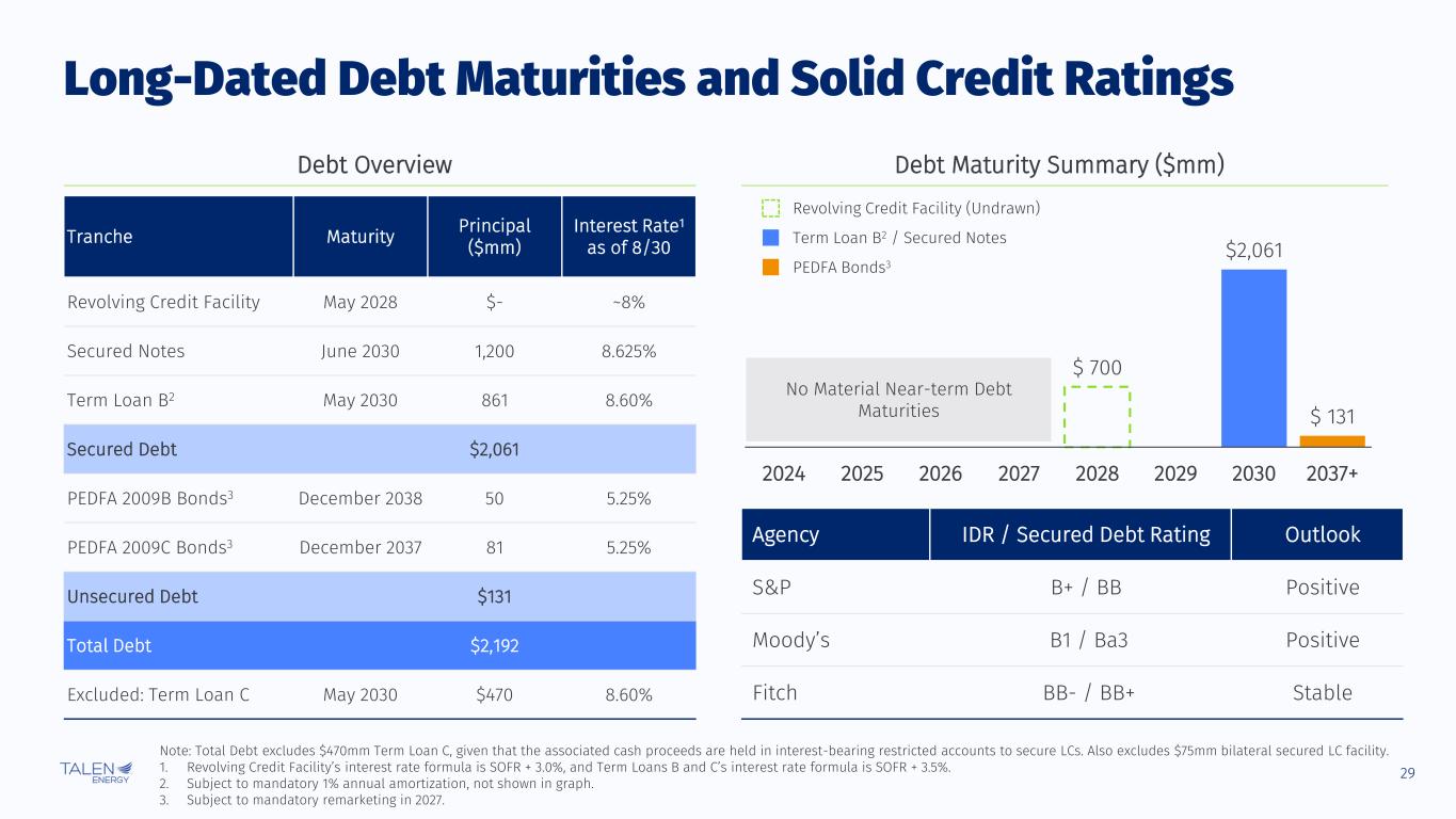 28 $570 $570 $580 2024E 2025E 2026E $100 $100 $135 $80 $100 $90 2024E 2025E 2026E Nuclear Fuel Maintenance & Other $225 $200 $180 Increases due to investments in continuing operations and hardening assets for reliability purposes Note: Represents the midpoint of each guidance and outlook range provided. 1. Includes January – April contribution from the ERCOT generation fleet. O&M and Capital Expenditure Projections O&M Expenses ($mm) Capital Expenditures ($mm) 1 1