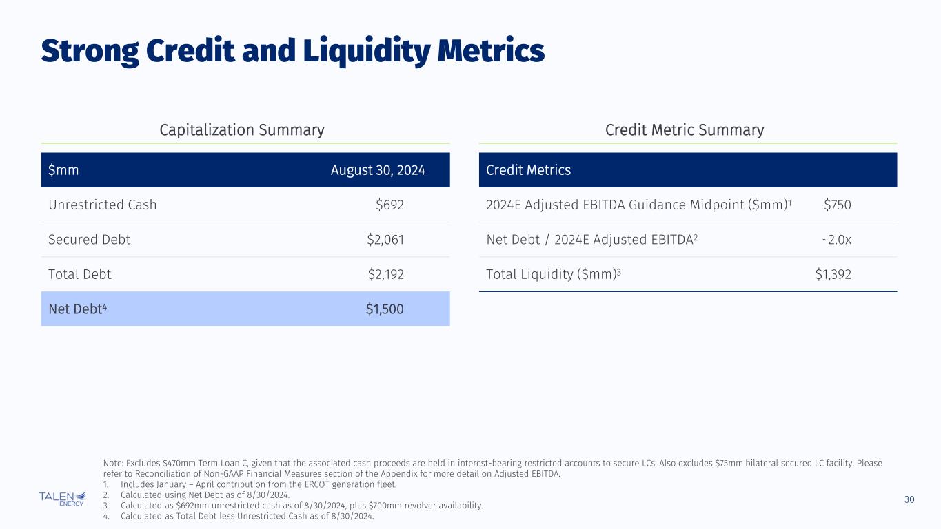 29 Agency IDR / Secured Debt Rating Outlook S&P B+ / BB Positive Moody’s B1 / Ba3 Positive Fitch BB- / BB+ Stable Note: Total Debt excludes $470mm Term Loan C, given that the associated cash proceeds are held in interest-bearing restricted accounts to secure LCs. Also excludes $75mm bilateral secured LC facility. 1. Revolving Credit Facility’s interest rate formula is SOFR + 3.0%, and Term Loans B and C’s interest rate formula is SOFR + 3.5%. 2. Subject to mandatory 1% annual amortization, not shown in graph. 3. Subject to mandatory remarketing in 2027. Long-Dated Debt Maturities and Solid Credit Ratings Debt Overview Debt Maturity Summary ($mm) $ 700 $2,061 $ 131 2024 2025 2026 2027 2028 2029 2030 2037+ Revolving Credit Facility (Undrawn) Term Loan B2 / Secured Notes PEDFA Bonds3 No Material Near-term Debt Maturities Tranche Maturity Principal ($mm) Interest Rate1 as of 8/30 Revolving Credit Facility May 2028 $- ~8% Secured Notes June 2030 1,200 8.625% Term Loan B2 May 2030 861 8.60% Secured Debt $2,061 PEDFA 2009B Bonds3 December 2038 50 5.25% PEDFA 2009C Bonds3 December 2037 81 5.25% Unsecured Debt $131 Total Debt $2,192 Excluded: Term Loan C May 2030 $470 8.60%