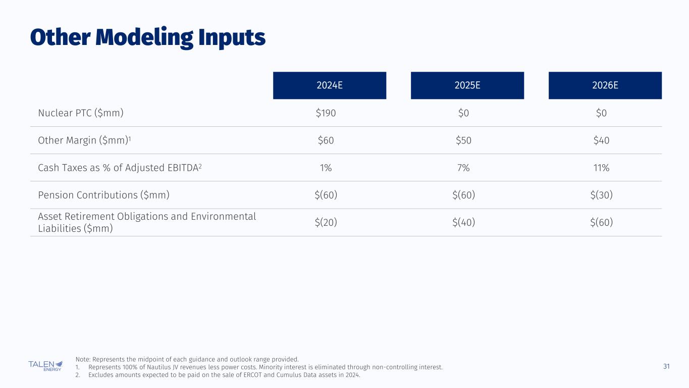 30 Note: Excludes $470mm Term Loan C, given that the associated cash proceeds are held in interest-bearing restricted accounts to secure LCs. Also excludes $75mm bilateral secured LC facility. Please refer to Reconciliation of Non-GAAP Financial Measures section of the Appendix for more detail on Adjusted EBITDA. 1. Includes January – April contribution from the ERCOT generation fleet. 2. Calculated using Net Debt as of 8/30/2024. 3. Calculated as $692mm unrestricted cash as of 8/30/2024, plus $700mm revolver availability. 4. Calculated as Total Debt less Unrestricted Cash as of 8/30/2024. Strong Credit and Liquidity Metrics $mm August 30, 2024 Unrestricted Cash $692 Secured Debt $2,061 Total Debt $2,192 Net Debt4 $1,500 Capitalization Summary Credit Metric Summary Credit Metrics 2024E Adjusted EBITDA Guidance Midpoint ($mm)1 $750 Net Debt / 2024E Adjusted EBITDA2 ~2.0x Total Liquidity ($mm)3 $1,392