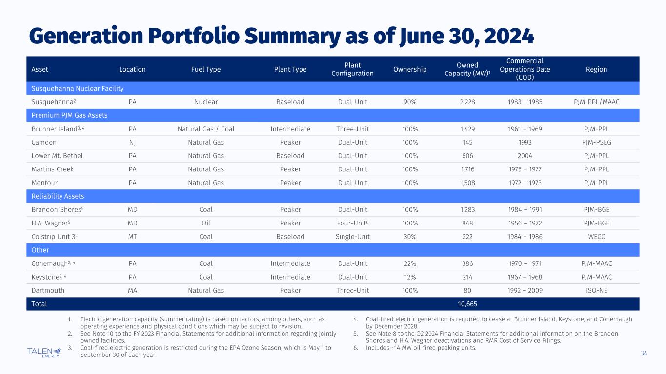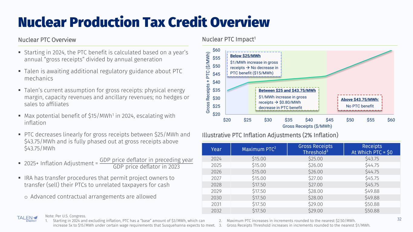 32 ▪ Starting in 2024, the PTC benefit is calculated based on a year’s annual “gross receipts” divided by annual generation ▪ Talen is awaiting additional regulatory guidance about PTC mechanics ▪ Talen’s current assumption for gross receipts: physical energy margin, capacity revenues and ancillary revenues; no hedges or sales to affiliates ▪ Max potential benefit of $15/MWh1 in 2024, escalating with inflation ▪ PTC decreases linearly for gross receipts between $25/MWh and $43.75/MWh and is fully phased out at gross receipts above $43.75/MWh ▪ 2025+ Inflation Adjustment = GDP price deflator in preceding year GDP price deflator in 2023 ▪ IRA has transfer procedures that permit project owners to transfer (sell) their PTCs to unrelated taxpayers for cash o Advanced contractual arrangements are allowed Note: Per U.S. Congress. 1. Starting in 2024 and excluding inflation, PTC has a “base” amount of $3/MWh, which can increase 5x to $15/MWh under certain wage requirements that Susquehanna expects to meet. 2. Maximum PTC increases in increments rounded to the nearest $2.50/MWh. 3. Gross Receipts Threshold increases in increments rounded to the nearest $1/MWh. Nuclear Production Tax Credit Overview Year Maximum PTC2 Gross Receipts Threshold3 Receipts At Which PTC = $0 2024 $15.00 $25.00 $43.75 2025 $15.00 $26.00 $44.75 2026 $15.00 $26.00 $44.75 2027 $15.00 $27.00 $45.75 2028 $17.50 $27.00 $45.75 2029 $17.50 $28.00 $49.88 2030 $17.50 $28.00 $49.88 2031 $17.50 $29.00 $50.88 2032 $17.50 $29.00 $50.88 $20 $25 $30 $35 $40 $45 $50 $55 $60 $20 $25 $30 $35 $40 $45 $50 $55 $60 G ro s s R e c e ip ts + P T C ( $ /M W h ) Gross Receipts ($/MWh) Above $43.75/MWh: No PTC benefit Between $25 and $43.75/MWh $1/MWh increase in gross receipts → $0.80/MWh decrease in PTC benefit Below $25/MWh $1/MWh increase in gross receipts → No decrease in PTC benefit ($15/MWh) Nuclear PTC Overview Nuclear PTC Impact1 Illustrative PTC Inflation Adjustments (2% Inflation)
