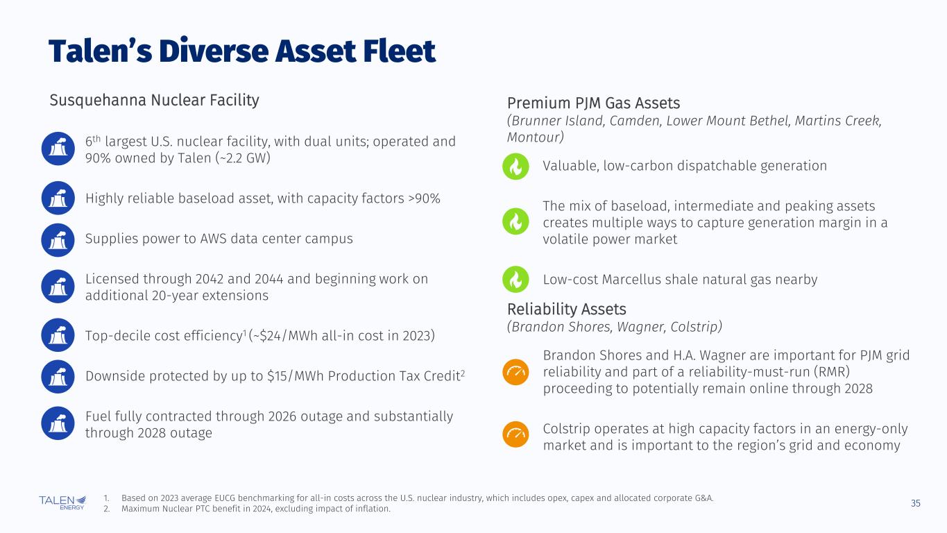 34 Asset Location Fuel Type Plant Type Plant Configuration Ownership Owned Capacity (MW)1 Commercial Operations Date (COD) Region Susquehanna Nuclear Facility Susquehanna2 PA Nuclear Baseload Dual-Unit 90% 2,228 1983 – 1985 PJM-PPL/MAAC Premium PJM Gas Assets Brunner Island3, 4 PA Natural Gas / Coal Intermediate Three-Unit 100% 1,429 1961 – 1969 PJM-PPL Camden NJ Natural Gas Peaker Dual-Unit 100% 145 1993 PJM-PSEG Lower Mt. Bethel PA Natural Gas Baseload Dual-Unit 100% 606 2004 PJM-PPL Martins Creek PA Natural Gas Peaker Dual-Unit 100% 1,716 1975 – 1977 PJM-PPL Montour PA Natural Gas Peaker Dual-Unit 100% 1,508 1972 – 1973 PJM-PPL Reliability Assets Brandon Shores5 MD Coal Peaker Dual-Unit 100% 1,283 1984 – 1991 PJM-BGE H.A. Wagner5 MD Oil Peaker Four-Unit6 100% 848 1956 – 1972 PJM-BGE Colstrip Unit 32 MT Coal Baseload Single-Unit 30% 222 1984 – 1986 WECC Other Conemaugh2, 4 PA Coal Intermediate Dual-Unit 22% 386 1970 – 1971 PJM-MAAC Keystone2, 4 PA Coal Intermediate Dual-Unit 12% 214 1967 – 1968 PJM-MAAC Dartmouth MA Natural Gas Peaker Three-Unit 100% 80 1992 – 2009 ISO-NE Total 10,665 Generation Portfolio Summary as of June 30, 2024 1. Electric generation capacity (summer rating) is based on factors, among others, such as operating experience and physical conditions which may be subject to revision. 2. See Note 10 to the FY 2023 Financial Statements for additional information regarding jointly owned facilities. 3. Coal-fired electric generation is restricted during the EPA Ozone Season, which is May 1 to September 30 of each year. 4. Coal-fired electric generation is required to cease at Brunner Island, Keystone, and Conemaugh by December 2028. 5. See Note 8 to the Q2 2024 Financial Statements for additional information on the Brandon Shores and H.A. Wagner deactivations and RMR Cost of Service Filings. 6. Includes ~14 MW oil-fired peaking units.