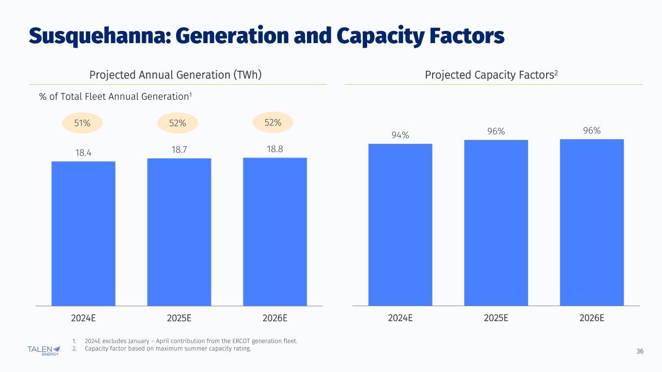 35 Talen’s Diverse Asset Fleet Premium PJM Gas Assets (Brunner Island, Camden, Lower Mount Bethel, Martins Creek, Montour) Valuable, low-carbon dispatchable generation The mix of baseload, intermediate and peaking assets creates multiple ways to capture generation margin in a volatile power market Low-cost Marcellus shale natural gas nearby Reliability Assets (Brandon Shores, Wagner, Colstrip) Brandon Shores and H.A. Wagner are important for PJM grid reliability and part of a reliability-must-run (RMR) proceeding to potentially remain online through 2028 Colstrip operates at high capacity factors in an energy-only market and is important to the region’s grid and economy 1. Based on 2023 average EUCG benchmarking for all-in costs across the U.S. nuclear industry, which includes opex, capex and allocated corporate G&A. 2. Maximum Nuclear PTC benefit in 2024, excluding impact of inflation. Susquehanna Nuclear Facility ▪ 6th largest U.S. nuclear facility, with dual units; operated and 90% owned by Talen (~2.2 GW) ▪ Highly reliable baseload asset, with capacity factors >90% ▪ Supplies power to AWS data center campus ▪ Licensed through 2042 and 2044 and beginning work on additional 20-year extensions ▪ Top-decile cost efficiency1 (~$24/MWh all-in cost in 2023) ▪ Downside protected by up to $15/MWh Production Tax Credit2 ▪ Fuel fully contracted through 2026 outage and substantially through 2028 outage