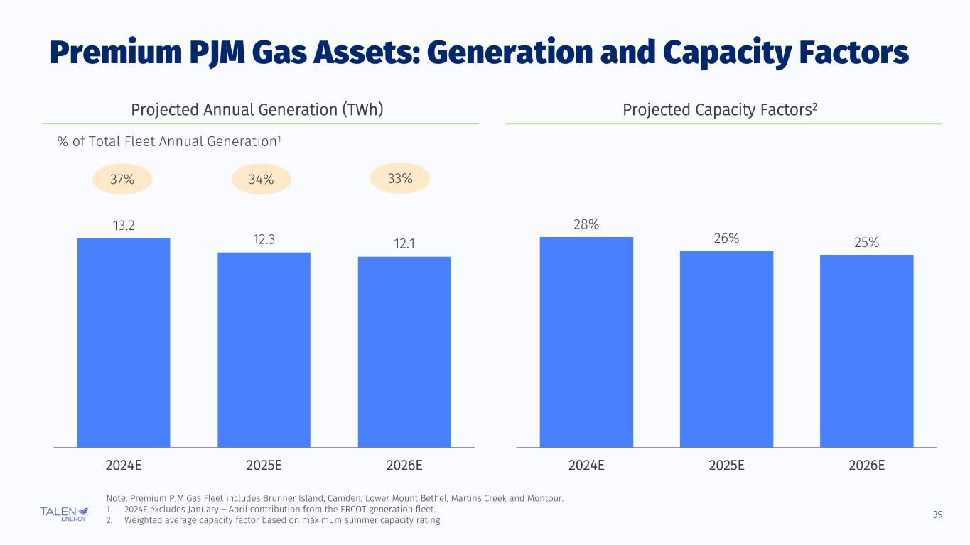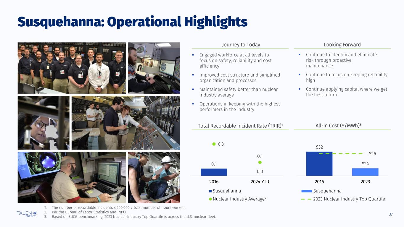 36 Susquehanna: Generation and Capacity Factors % of Total Fleet Annual Generation1 1. 2024E excludes January – April contribution from the ERCOT generation fleet. 2. Capacity factor based on maximum summer capacity rating. 18.4 18.7 18.8 2024E 2025E 2026E 51% 52% 52% 94% 96% 96% 2024E 2025E 2026E Projected Annual Generation (TWh) Projected Capacity Factors2