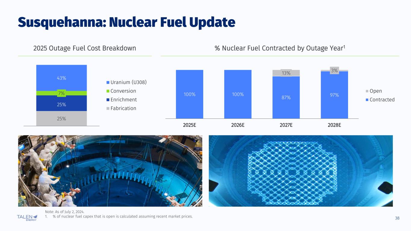 37 ▪ Engaged workforce at all levels to focus on safety, reliability and cost efficiency ▪ Improved cost structure and simplified organization and processes ▪ Maintained safety better than nuclear industry average ▪ Operations in keeping with the highest performers in the industry ▪ Continue to identify and eliminate risk through proactive maintenance ▪ Continue to focus on keeping reliability high ▪ Continue applying capital where we get the best return Total Recordable Incident Rate (TRIR)1 0.1 0.0 0.3 0.1 2016 2024 YTD Susquehanna Nuclear Industry Average² $32 $24 $26 2016 2023 Susquehanna 2023 Nuclear Industry Top Quartile 1. The number of recordable incidents x 200,000 / total number of hours worked. 2. Per the Bureau of Labor Statistics and INPO. 3. Based on EUCG benchmarking; 2023 Nuclear Industry Top Quartile is across the U.S. nuclear fleet. Susquehanna: Operational Highlights Journey to Today Looking Forward All-In Cost ($/MWh)3