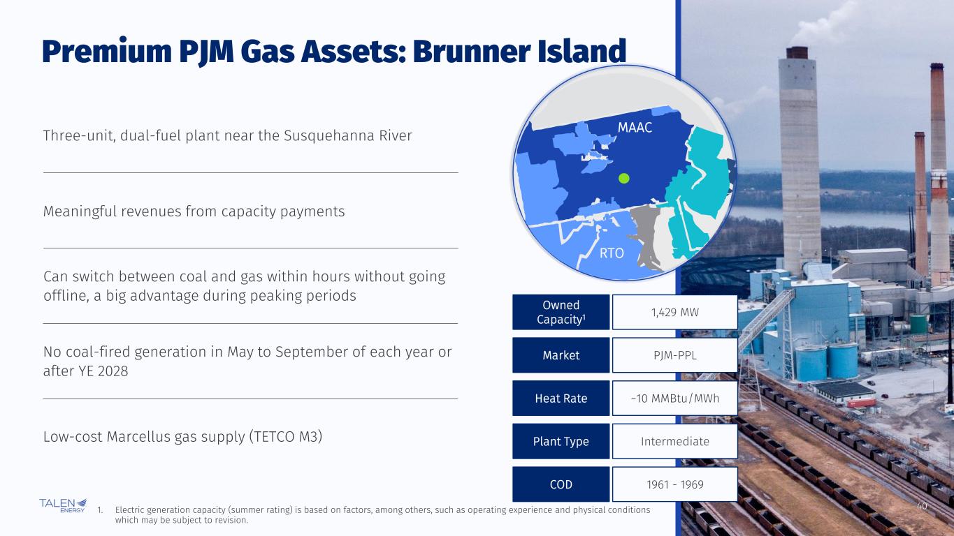 39 Premium PJM Gas Assets: Generation and Capacity Factors % of Total Fleet Annual Generation1 Note: Premium PJM Gas Fleet includes Brunner Island, Camden, Lower Mount Bethel, Martins Creek and Montour. 1. 2024E excludes January – April contribution from the ERCOT generation fleet. 2. Weighted average capacity factor based on maximum summer capacity rating. Projected Annual Generation (TWh) Projected Capacity Factors2 37% 34% 33% 13.2 12.3 12.1 2024E 2025E 2026E 28% 26% 25% 2024E 2025E 2026E