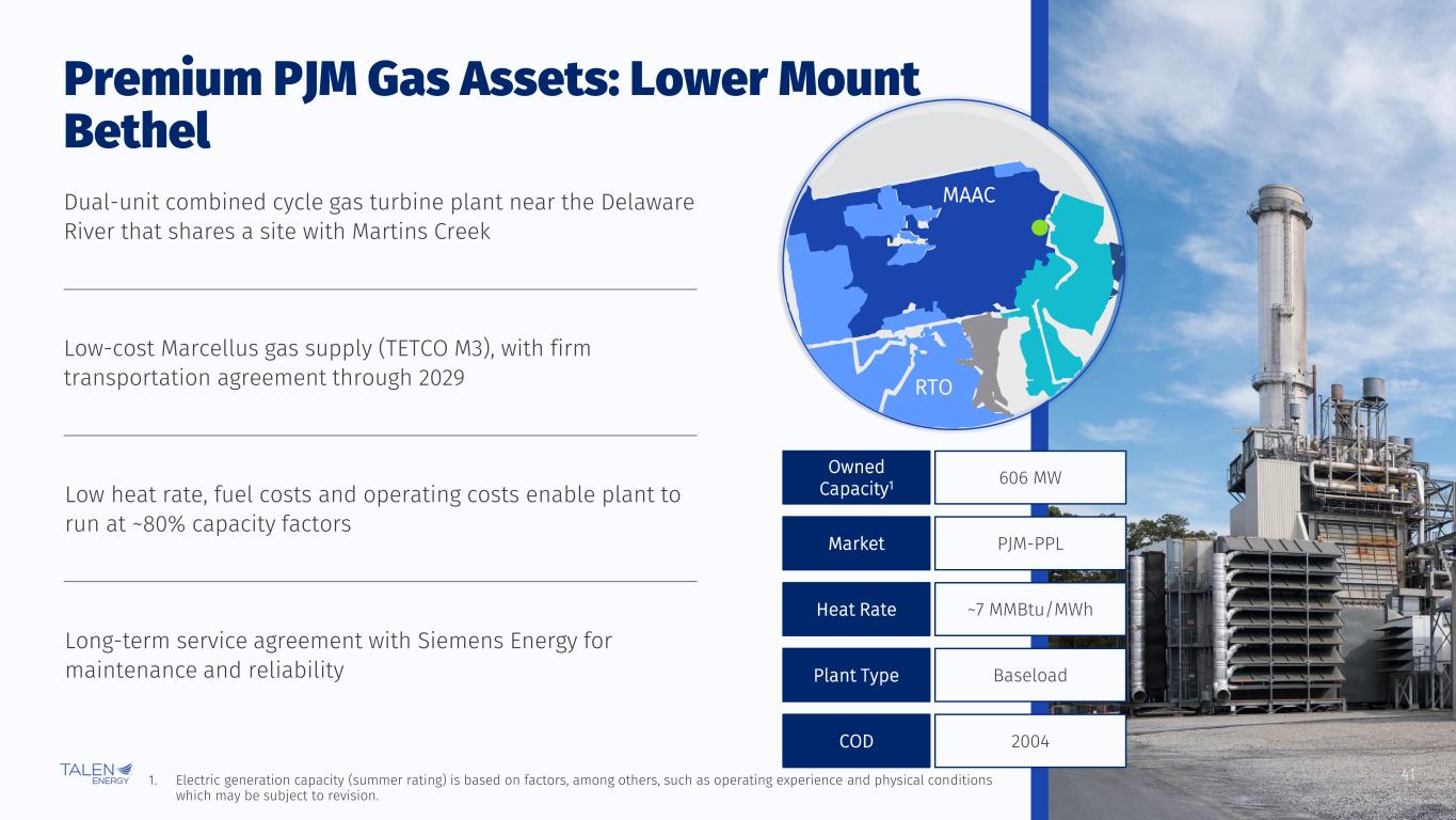 40 Premium PJM Gas Assets: Brunner Island MAAC RTO 1,429 MW Owned Capacity1 PJM-PPLMarket ~10 MMBtu/MWhHeat Rate IntermediatePlant Type 1961 - 1969COD Three-unit, dual-fuel plant near the Susquehanna River Can switch between coal and gas within hours without going offline, a big advantage during peaking periods Low-cost Marcellus gas supply (TETCO M3) No coal-fired generation in May to September of each year or after YE 2028 1. Electric generation capacity (summer rating) is based on factors, among others, such as operating experience and physical conditions which may be subject to revision. Meaningful revenues from capacity payments