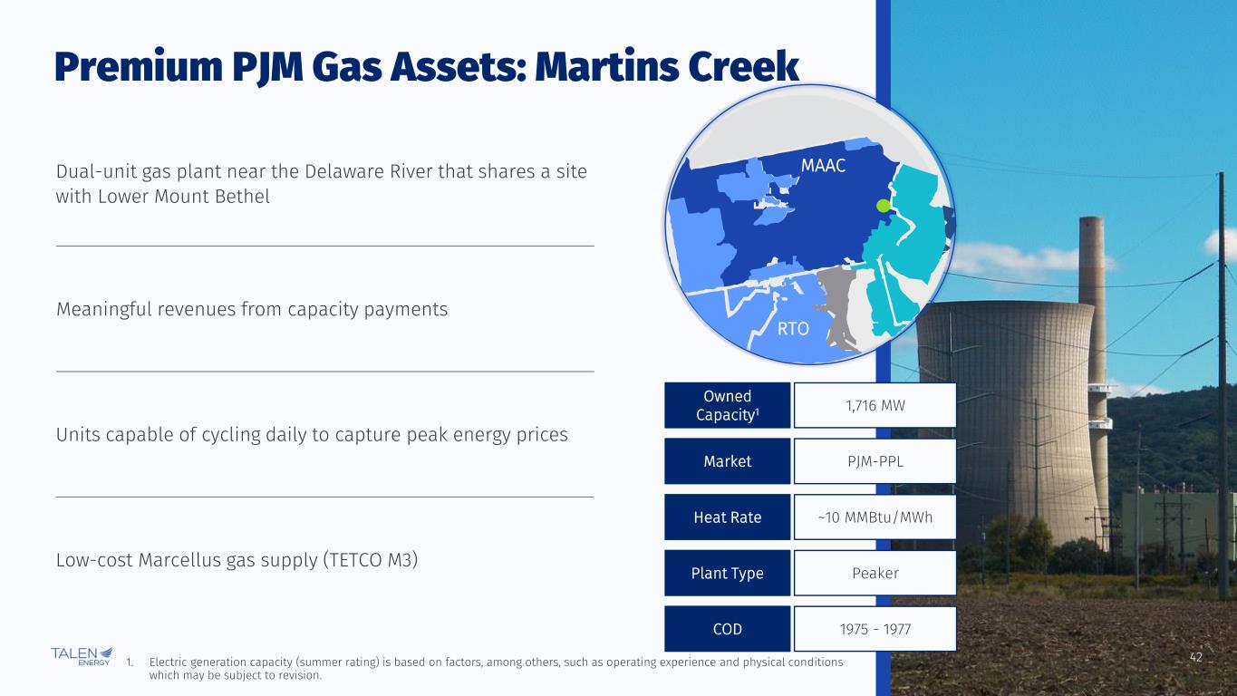 41 Premium PJM Gas Assets: Lower Mount Bethel MAAC RTO 606 MW Owned Capacity1 PJM-PPLMarket ~7 MMBtu/MWhHeat Rate BaseloadPlant Type 2004COD Dual-unit combined cycle gas turbine plant near the Delaware River that shares a site with Martins Creek Low-cost Marcellus gas supply (TETCO M3), with firm transportation agreement through 2029 Long-term service agreement with Siemens Energy for maintenance and reliability Low heat rate, fuel costs and operating costs enable plant to run at ~80% capacity factors 1. Electric generation capacity (summer rating) is based on factors, among others, such as operating experience and physical conditions which may be subject to revision.