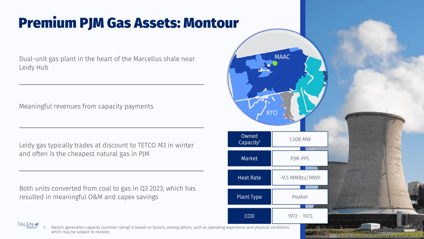 42 Premium PJM Gas Assets: Martins Creek MAAC RTO 1,716 MW Owned Capacity1 PJM-PPLMarket ~10 MMBtu/MWhHeat Rate PeakerPlant Type 1975 - 1977COD Dual-unit gas plant near the Delaware River that shares a site with Lower Mount Bethel Meaningful revenues from capacity payments Low-cost Marcellus gas supply (TETCO M3) Units capable of cycling daily to capture peak energy prices 1. Electric generation capacity (summer rating) is based on factors, among others, such as operating experience and physical conditions which may be subject to revision.