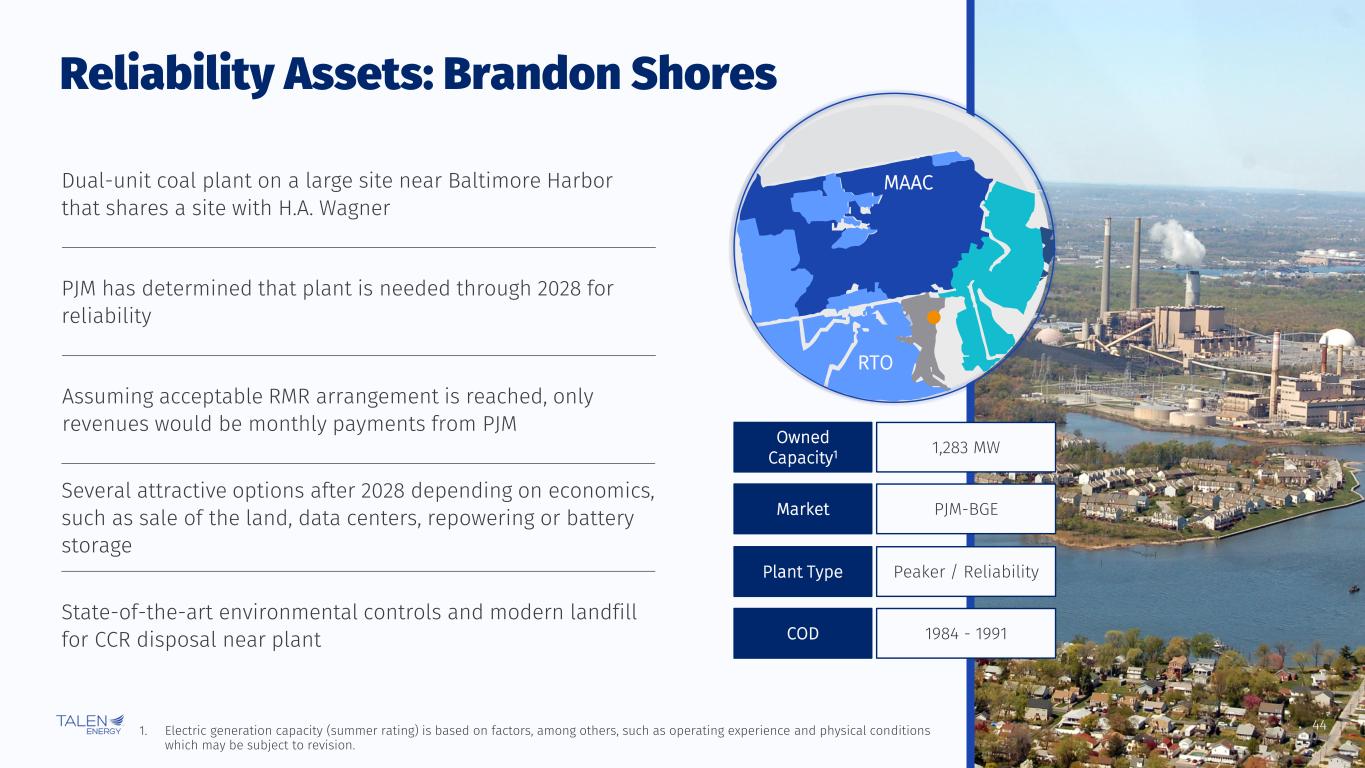 43 Premium PJM Gas Assets: Montour MAAC RTO 1,508 MW Owned Capacity1 PJM-PPLMarket ~9.5 MMBtu/MWhHeat Rate PeakerPlant Type 1972 - 1973COD Dual-unit gas plant in the heart of the Marcellus shale near Leidy Hub Leidy gas typically trades at discount to TETCO M3 in winter and often is the cheapest natural gas in PJM 1. Electric generation capacity (summer rating) is based on factors, among others, such as operating experience and physical conditions which may be subject to revision. Meaningful revenues from capacity payments Both units converted from coal to gas in Q3 2023, which has resulted in meaningful O&M and capex savings