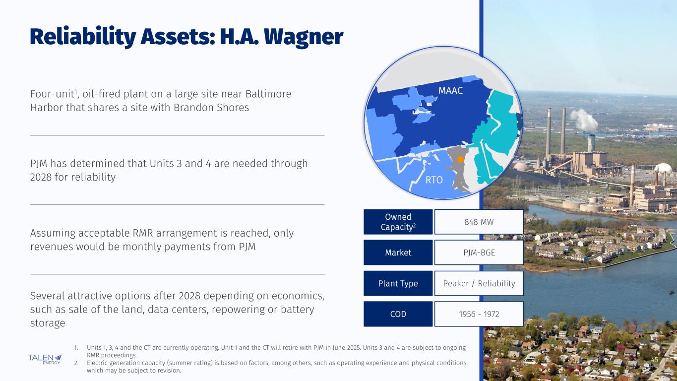 44 Reliability Assets: Brandon Shores MAAC RTO 1,283 MW Owned Capacity1 PJM-BGEMarket Peaker / ReliabilityPlant Type 1984 - 1991COD Dual-unit coal plant on a large site near Baltimore Harbor that shares a site with H.A. Wagner Assuming acceptable RMR arrangement is reached, only revenues would be monthly payments from PJM Several attractive options after 2028 depending on economics, such as sale of the land, data centers, repowering or battery storage 1. Electric generation capacity (summer rating) is based on factors, among others, such as operating experience and physical conditions which may be subject to revision. State-of-the-art environmental controls and modern landfill for CCR disposal near plant PJM has determined that plant is needed through 2028 for reliability