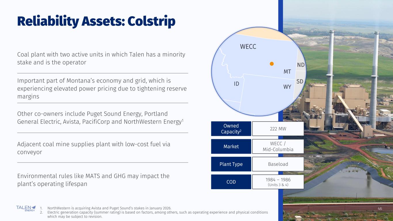 46 Reliability Assets: Colstrip 222 MW Owned Capacity2 WECC / Mid-ColumbiaMarket BaseloadPlant Type 1984 – 1986 (Units 3 & 4) COD WECC WY MT ND SDID Coal plant with two active units in which Talen has a minority stake and is the operator Other co-owners include Puget Sound Energy, Portland General Electric, Avista, PacifiCorp and NorthWestern Energy1 Important part of Montana’s economy and grid, which is experiencing elevated power pricing due to tightening reserve margins Environmental rules like MATS and GHG may impact the plant’s operating lifespan 1. NorthWestern is acquiring Avista and Puget Sound’s stakes in January 2026. 2. Electric generation capacity (summer rating) is based on factors, among others, such as operating experience and physical conditions which may be subject to revision. Adjacent coal mine supplies plant with low-cost fuel via conveyor