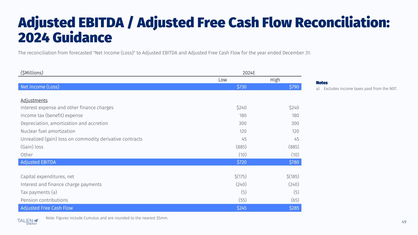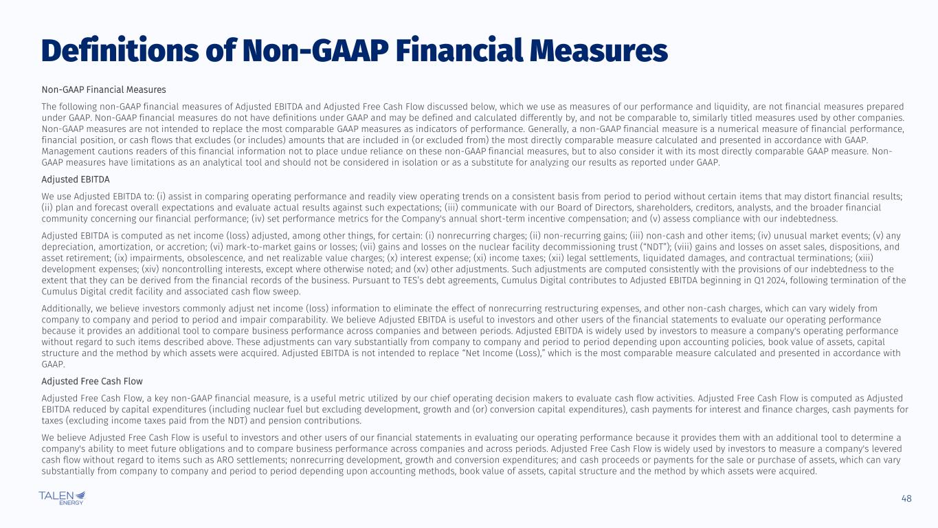 48 Definitions of Non-GAAP Financial Measures Non-GAAP Financial Measures The following non-GAAP financial measures of Adjusted EBITDA and Adjusted Free Cash Flow discussed below, which we use as measures of our performance and liquidity, are not financial measures prepared under GAAP. Non-GAAP financial measures do not have definitions under GAAP and may be defined and calculated differently by, and not be comparable to, similarly titled measures used by other companies. Non-GAAP measures are not intended to replace the most comparable GAAP measures as indicators of performance. Generally, a non-GAAP financial measure is a numerical measure of financial performance, financial position, or cash flows that excludes (or includes) amounts that are included in (or excluded from) the most directly comparable measure calculated and presented in accordance with GAAP. Management cautions readers of this financial information not to place undue reliance on these non-GAAP financial measures, but to also consider it with its most directly comparable GAAP measure. Non- GAAP measures have limitations as an analytical tool and should not be considered in isolation or as a substitute for analyzing our results as reported under GAAP. Adjusted EBITDA We use Adjusted EBITDA to: (i) assist in comparing operating performance and readily view operating trends on a consistent basis from period to period without certain items that may distort financial results; (ii) plan and forecast overall expectations and evaluate actual results against such expectations; (iii) communicate with our Board of Directors, shareholders, creditors, analysts, and the broader financial community concerning our financial performance; (iv) set performance metrics for the Company's annual short-term incentive compensation; and (v) assess compliance with our indebtedness. Adjusted EBITDA is computed as net income (loss) adjusted, among other things, for certain: (i) nonrecurring charges; (ii) non-recurring gains; (iii) non-cash and other items; (iv) unusual market events; (v) any depreciation, amortization, or accretion; (vi) mark-to-market gains or losses; (vii) gains and losses on the nuclear facility decommissioning trust (“NDT”); (viii) gains and losses on asset sales, dispositions, and asset retirement; (ix) impairments, obsolescence, and net realizable value charges; (x) interest expense; (xi) income taxes; (xii) legal settlements, liquidated damages, and contractual terminations; (xiii) development expenses; (xiv) noncontrolling interests, except where otherwise noted; and (xv) other adjustments. Such adjustments are computed consistently with the provisions of our indebtedness to the extent that they can be derived from the financial records of the business. Pursuant to TES’s debt agreements, Cumulus Digital contributes to Adjusted EBITDA beginning in Q1 2024, following termination of the Cumulus Digital credit facility and associated cash flow sweep. Additionally, we believe investors commonly adjust net income (loss) information to eliminate the effect of nonrecurring restructuring expenses, and other non-cash charges, which can vary widely from company to company and period to period and impair comparability. We believe Adjusted EBITDA is useful to investors and other users of the financial statements to evaluate our operating performance because it provides an additional tool to compare business performance across companies and between periods. Adjusted EBITDA is widely used by investors to measure a company's operating performance without regard to such items described above. These adjustments can vary substantially from company to company and period to period depending upon accounting policies, book value of assets, capital structure and the method by which assets were acquired. Adjusted EBITDA is not intended to replace “Net Income (Loss),” which is the most comparable measure calculated and presented in accordance with GAAP. Adjusted Free Cash Flow Adjusted Free Cash Flow, a key non-GAAP financial measure, is a useful metric utilized by our chief operating decision makers to evaluate cash flow activities. Adjusted Free Cash Flow is computed as Adjusted EBITDA reduced by capital expenditures (including nuclear fuel but excluding development, growth and (or) conversion capital expenditures), cash payments for interest and finance charges, cash payments for taxes (excluding income taxes paid from the NDT) and pension contributions. We believe Adjusted Free Cash Flow is useful to investors and other users of our financial statements in evaluating our operating performance because it provides them with an additional tool to determine a company's ability to meet future obligations and to compare business performance across companies and across periods. Adjusted Free Cash Flow is widely used by investors to measure a company's levered cash flow without regard to items such as ARO settlements; nonrecurring development, growth and conversion expenditures; and cash proceeds or payments for the sale or purchase of assets, which can vary substantially from company to company and period to period depending upon accounting methods, book value of assets, capital structure and the method by which assets were acquired. © Talen Energy Corporation