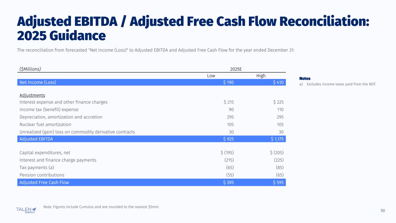 49 © Talen Energy Corporation ($Millions) 2024E Low High Net Income (Loss) $730 $790 Adjustments Interest expense and other finance charges $240 $240 Income tax (benefit) expense 180 180 Depreciation, amortization and accretion 300 300 Nuclear fuel amortization 120 120 Unrealized (gain) loss on commodity derivative contracts 45 45 (Gain) loss (885) (885) Other (10) (10) Adjusted EBITDA $720 $780 Capital expenditures, net $(175) $(185) Interest and finance charge payments (240) (240) Tax payments (a) (5) (5) Pension contributions (55) (65) Adjusted Free Cash Flow $245 $285 Adjusted EBITDA / Adjusted Free Cash Flow Reconciliation: 2024 Guidance The reconciliation from forecasted "Net Income (Loss)" to Adjusted EBITDA and Adjusted Free Cash Flow for the year ended December 31: Notes a) Excludes income taxes paid from the NDT. Note: Figures include Cumulus and are rounded to the nearest $5mm.