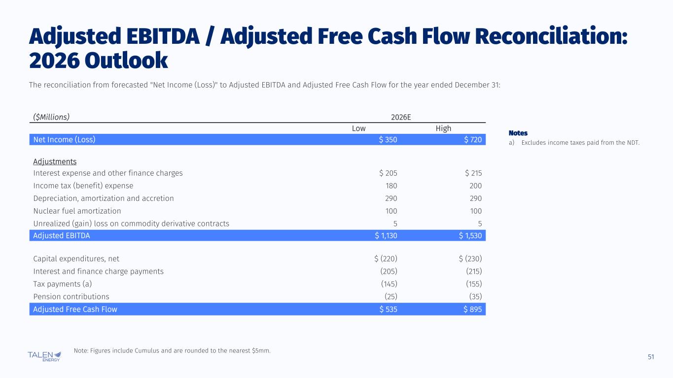 50 © Talen Energy Corporation ($Millions) 2025E Low High Net Income (Loss) $ 190 $ 410 Adjustments Interest expense and other finance charges $ 215 $ 225 Income tax (benefit) expense 90 110 Depreciation, amortization and accretion 295 295 Nuclear fuel amortization 105 105 Unrealized (gain) loss on commodity derivative contracts 30 30 Adjusted EBITDA $ 925 $ 1,175 Capital expenditures, net $ (195) $ (205) Interest and finance charge payments (215) (225) Tax payments (a) (65) (85) Pension contributions (55) (65) Adjusted Free Cash Flow $ 395 $ 595 Adjusted EBITDA / Adjusted Free Cash Flow Reconciliation: 2025 Guidance The reconciliation from forecasted "Net Income (Loss)" to Adjusted EBITDA and Adjusted Free Cash Flow for the year ended December 31: Notes a) Excludes income taxes paid from the NDT. Note: Figures include Cumulus and are rounded to the nearest $5mm.