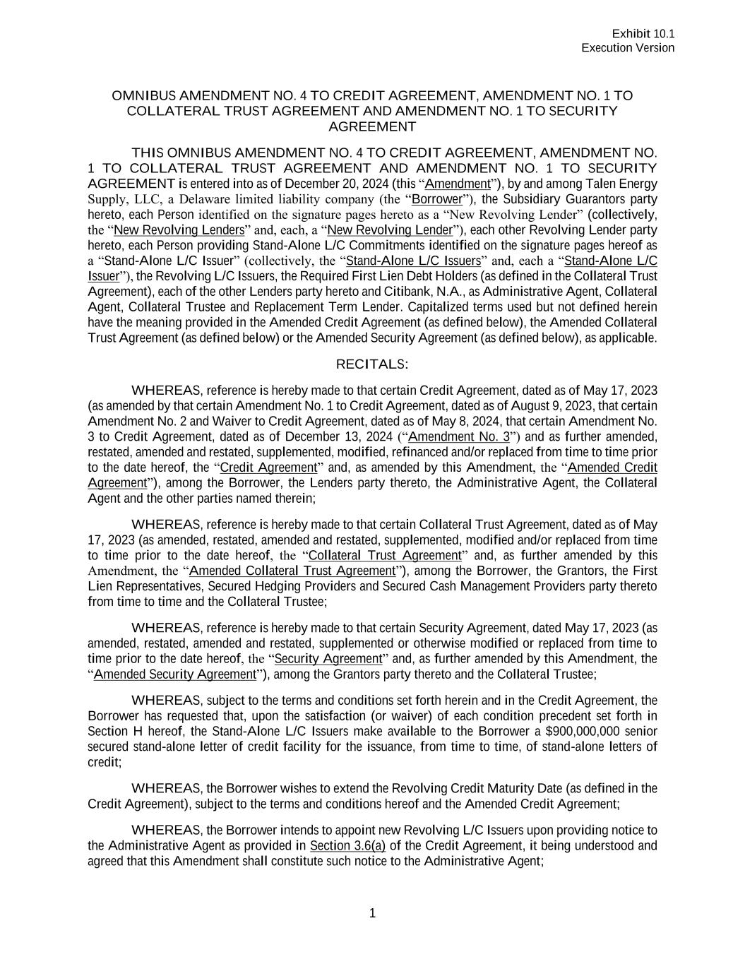 1 OMNIBUS AMENDMENT NO. 4 TO CREDIT AGREEMENT, AMENDMENT NO. 1 TO COLLATERAL TRUST AGREEMENT AND AMENDMENT NO. 1 TO SECURITY AGREEMENT THIS OMNIBUS AMENDMENT NO. 4 TO CREDIT AGREEMENT, AMENDMENT NO. 1 TO COLLATERAL TRUST AGREEMENT AND AMENDMENT NO. 1 TO SECURITY AGREEMENT is entered into as of December 20, 2024 (this “Amendment”), by and among Talen Energy Supply, LLC, a Delaware limited liability company (the “Borrower”), the Subsidiary Guarantors party hereto, each Person identified on the signature pages hereto as a “New Revolving Lender” (collectively, the “New Revolving Lenders” and, each, a “New Revolving Lender”), each other Revolving Lender party hereto, each Person providing Stand-Alone L/C Commitments identified on the signature pages hereof as a “Stand-Alone L/C Issuer” (collectively, the “Stand-Alone L/C Issuers” and, each a “Stand-Alone L/C Issuer”), the Revolving L/C Issuers, the Required First Lien Debt Holders (as defined in the Collateral Trust Agreement), each of the other Lenders party hereto and Citibank, N.A., as Administrative Agent, Collateral Agent, Collateral Trustee and Replacement Term Lender. Capitalized terms used but not defined herein have the meaning provided in the Amended Credit Agreement (as defined below), the Amended Collateral Trust Agreement (as defined below) or the Amended Security Agreement (as defined below), as applicable. RECITALS: WHEREAS, reference is hereby made to that certain Credit Agreement, dated as of May 17, 2023 (as amended by that certain Amendment No. 1 to Credit Agreement, dated as of August 9, 2023, that certain Amendment No. 2 and Waiver to Credit Agreement, dated as of May 8, 2024, that certain Amendment No. 3 to Credit Agreement, dated as of December 13, 2024 (“Amendment No. 3”) and as further amended, restated, amended and restated, supplemented, modified, refinanced and/or replaced from time to time prior to the date hereof, the “Credit Agreement” and, as amended by this Amendment, the “Amended Credit Agreement”), among the Borrower, the Lenders party thereto, the Administrative Agent, the Collateral Agent and the other parties named therein; WHEREAS, reference is hereby made to that certain Collateral Trust Agreement, dated as of May 17, 2023 (as amended, restated, amended and restated, supplemented, modified and/or replaced from time to time prior to the date hereof, the “Collateral Trust Agreement” and, as further amended by this Amendment, the “Amended Collateral Trust Agreement”), among the Borrower, the Grantors, the First Lien Representatives, Secured Hedging Providers and Secured Cash Management Providers party thereto from time to time and the Collateral Trustee; WHEREAS, reference is hereby made to that certain Security Agreement, dated May 17, 2023 (as amended, restated, amended and restated, supplemented or otherwise modified or replaced from time to time prior to the date hereof, the “Security Agreement” and, as further amended by this Amendment, the “Amended Security Agreement”), among the Grantors party thereto and the Collateral Trustee; WHEREAS, subject to the terms and conditions set forth herein and in the Credit Agreement, the Borrower has requested that, upon the satisfaction (or waiver) of each condition precedent set forth in Section H hereof, the Stand-Alone L/C Issuers make available to the Borrower a $900,000,000 senior secured stand-alone letter of credit facility for the issuance, from time to time, of stand-alone letters of credit; WHEREAS, the Borrower wishes to extend the Revolving Credit Maturity Date (as defined in the Credit Agreement), subject to the terms and conditions hereof and the Amended Credit Agreement; WHEREAS, the Borrower intends to appoint new Revolving L/C Issuers upon providing notice to the Administrative Agent as provided in Section 3.6(a) of the Credit Agreement, it being understood and agreed that this Amendment shall constitute such notice to the Administrative Agent; Exhibit 10.1 Execution Version